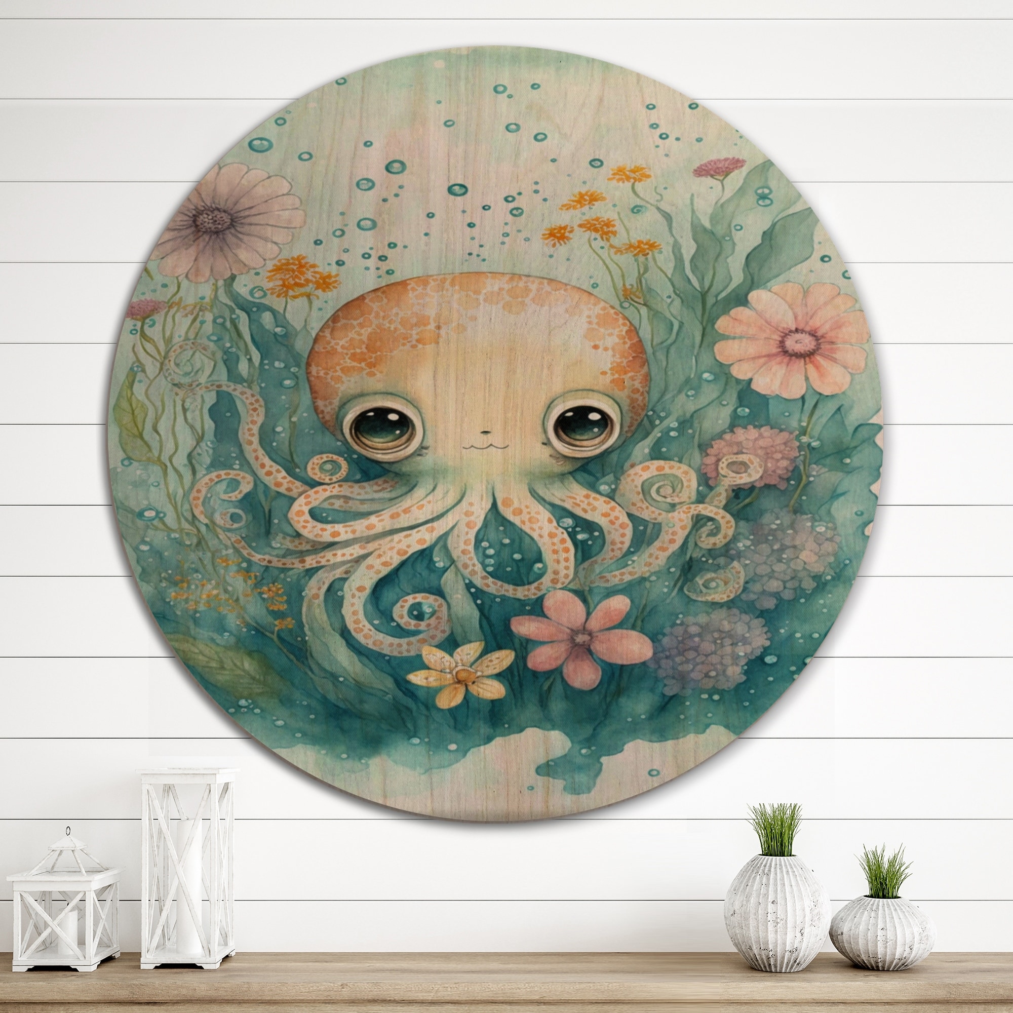 Designart "Cute Little Baby Octopus Surrounded By Flowers II" Animal Octopus Wood Wall Art - Natural Pine Wood