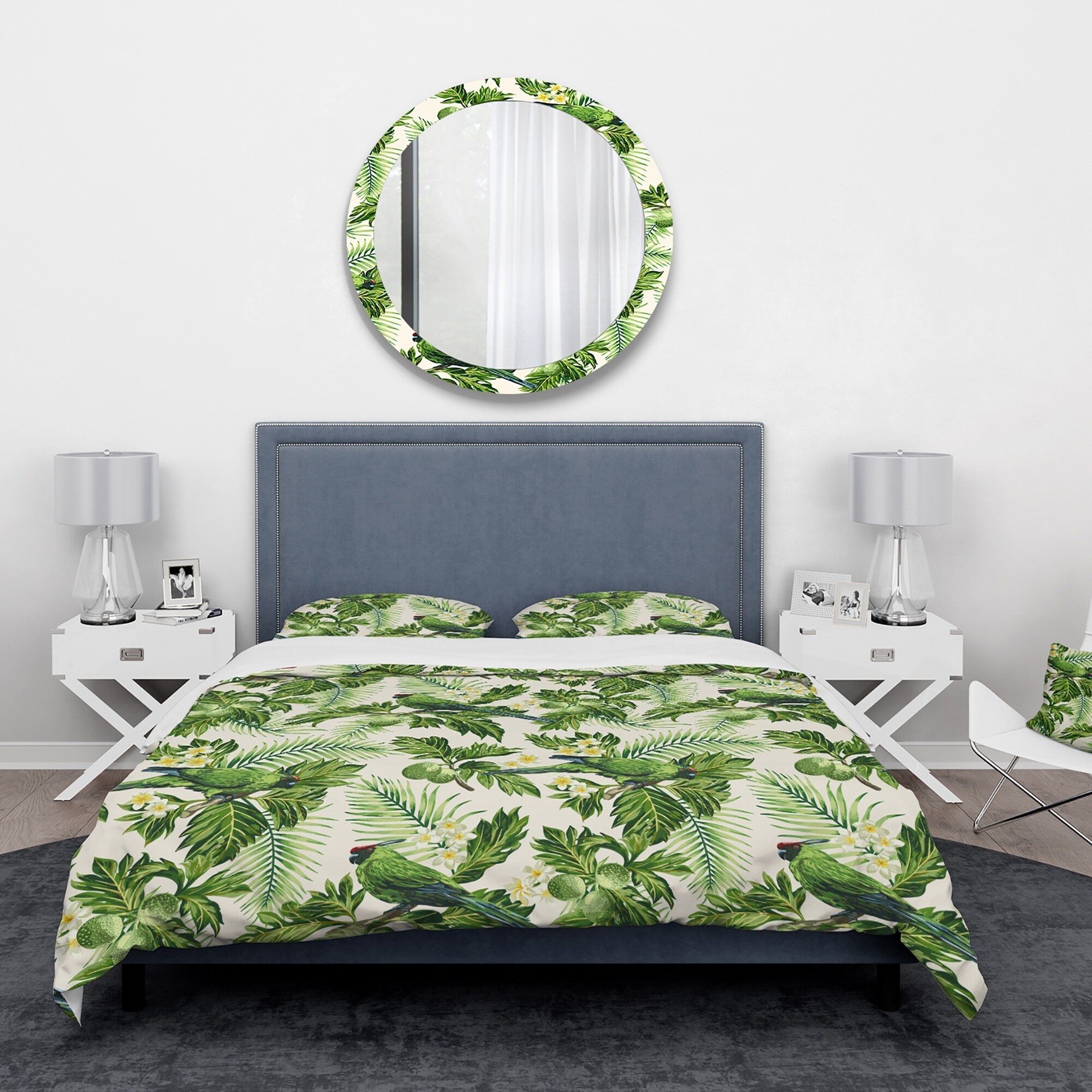 Designart 'Tropical Leaves, Green Bird and White Flowers' Animals Bedding Set - Duvet Cover & Shams