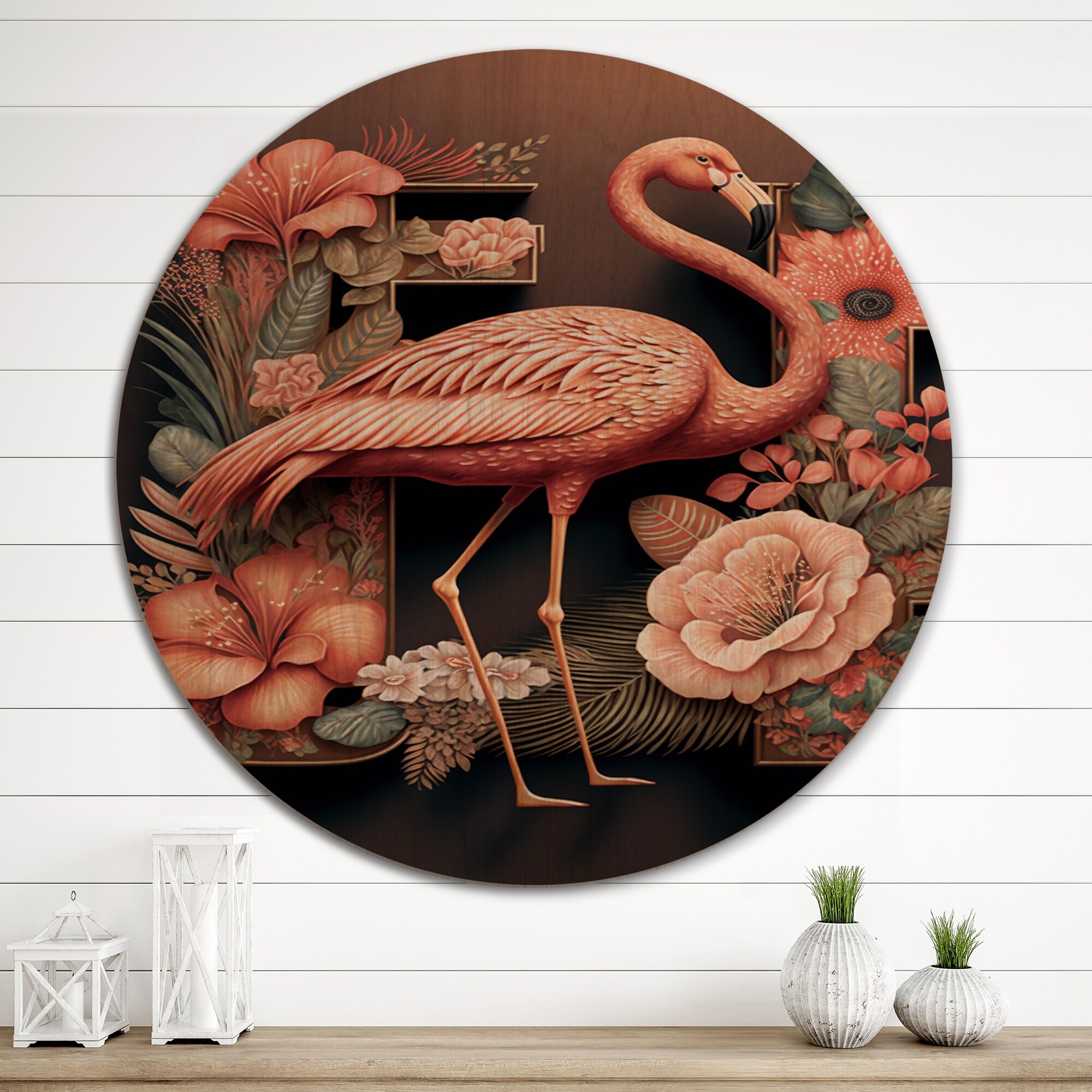 Designart "Pink Flamingo With Pink Flowers" Animals Flamingo Wood Wall Art - Natural Pine Wood