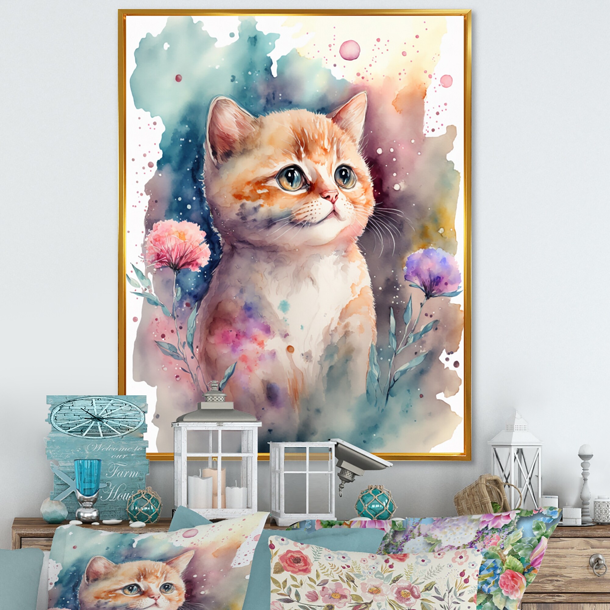 Designart "Little Kitten Surrounded By Colorful Flowers IV" Animals Cat Framed Canvas Wall Art Print