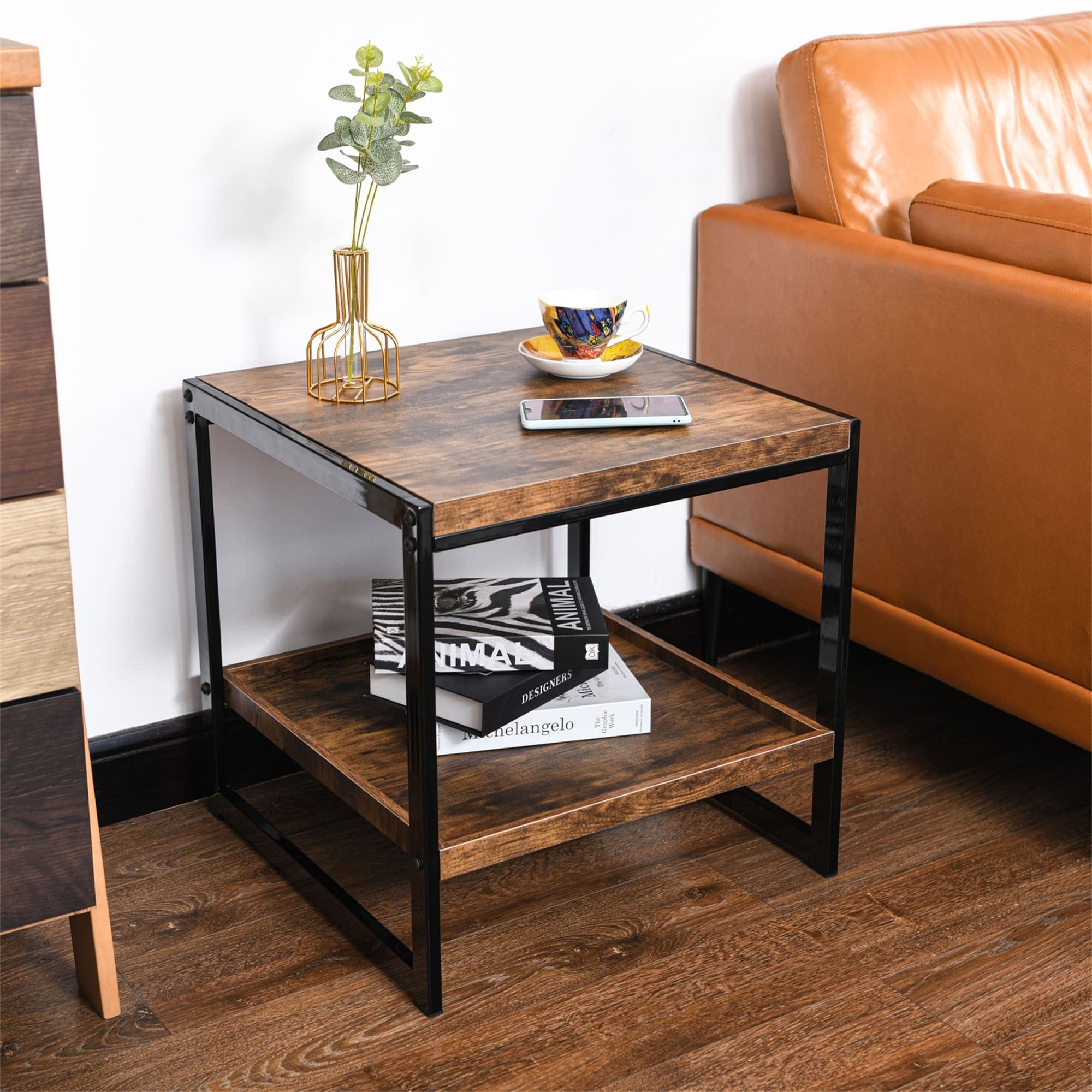 2-tiers Storage Shelf Sofa Table Antique Brown Square Coffee Table with Metal Frame Side Table for Living Room,Bedroom