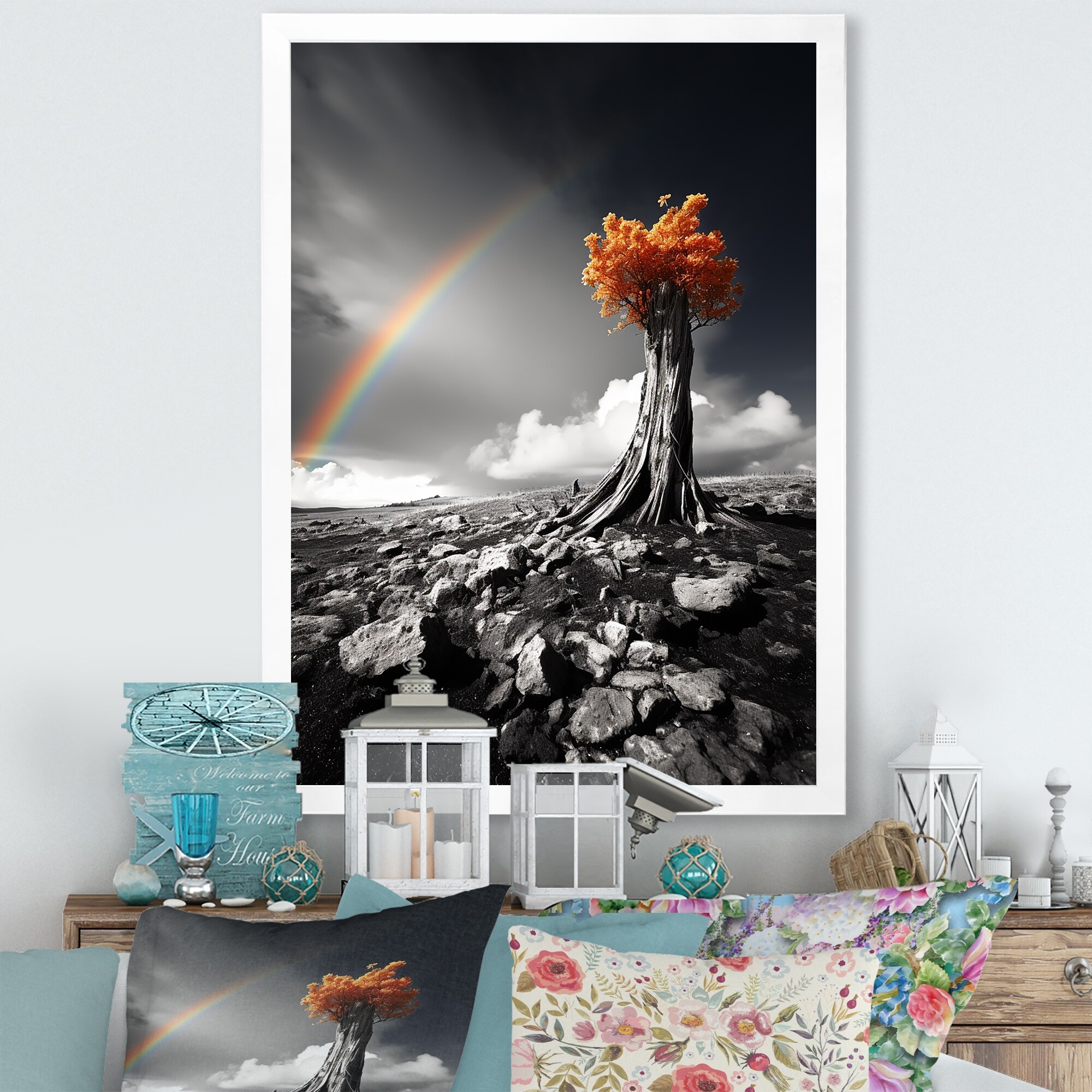 Designart "Rainbow Grayscale Arc Over Orange Tree" Rainbow Framed Wall Art Prints