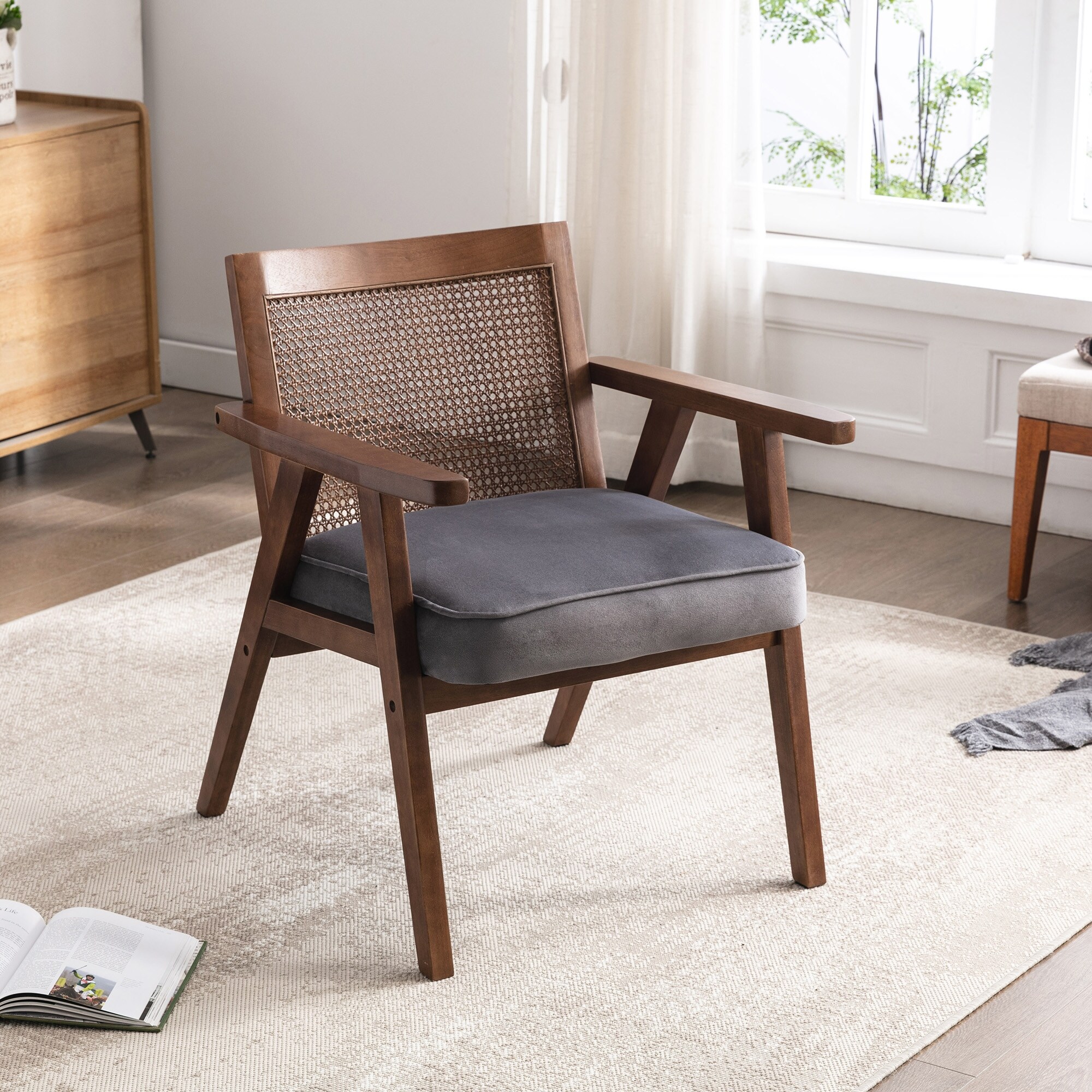 Wood Frame Arm Chair, Modern Accent Chair Velvet Upholstered Lounge Chair with Rattan Arms