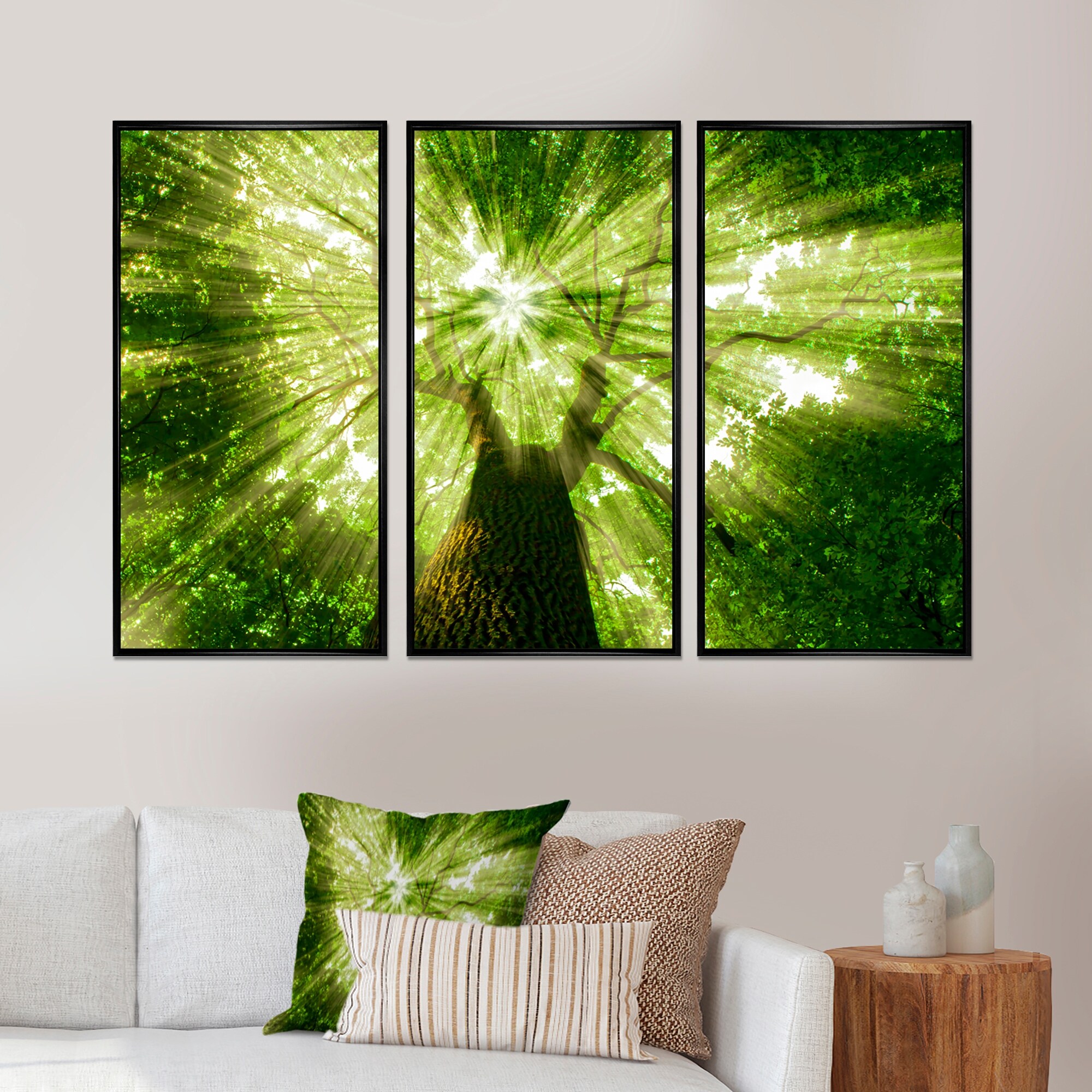 Designart "Sunlight Peeking through Green Tree" Landscape Framed Canvas Wall Art Set of 3 - 4 Colors of Frames
