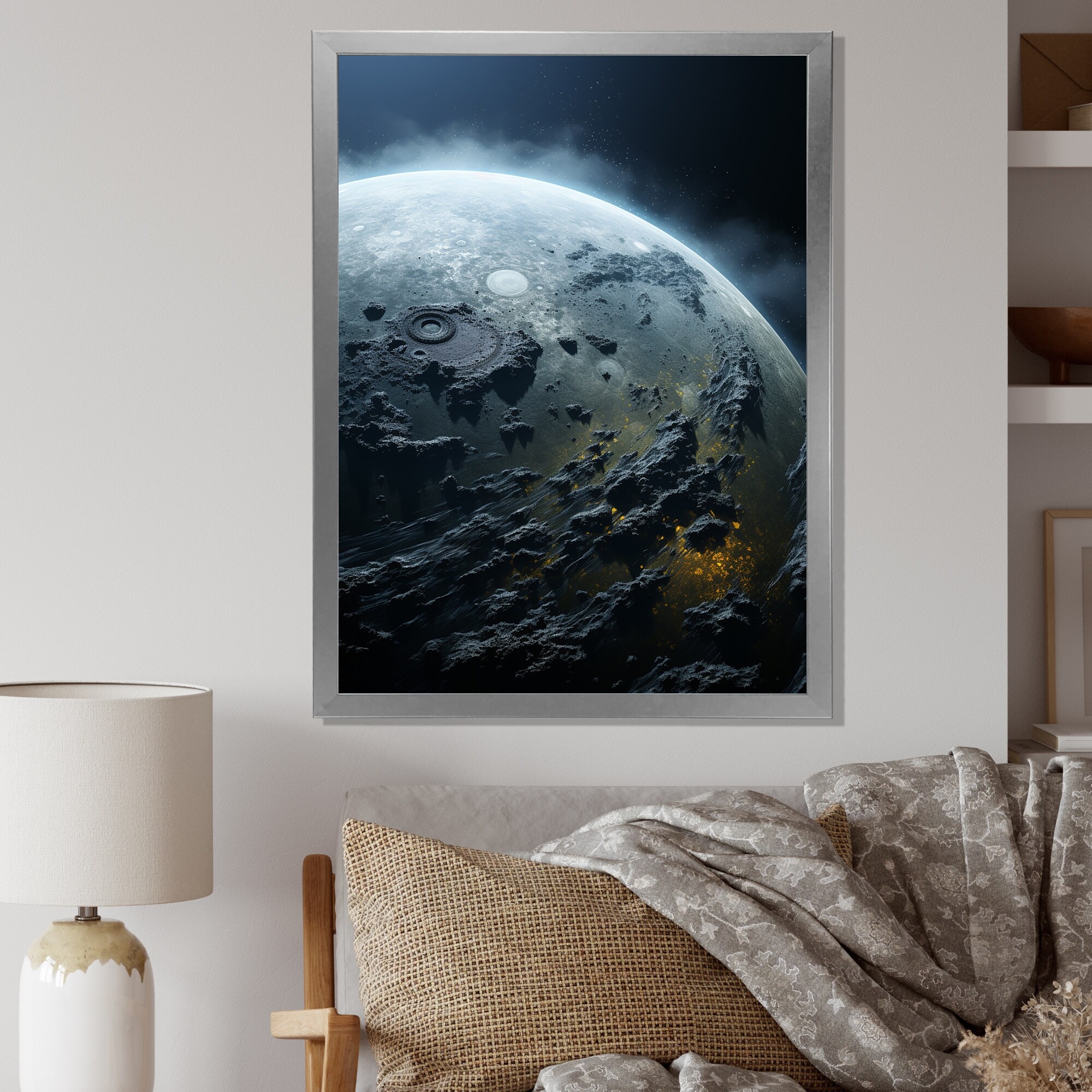 Designart "Grey Ganymede Planet Subdued" Space Planet Framed Wall Art Living Room