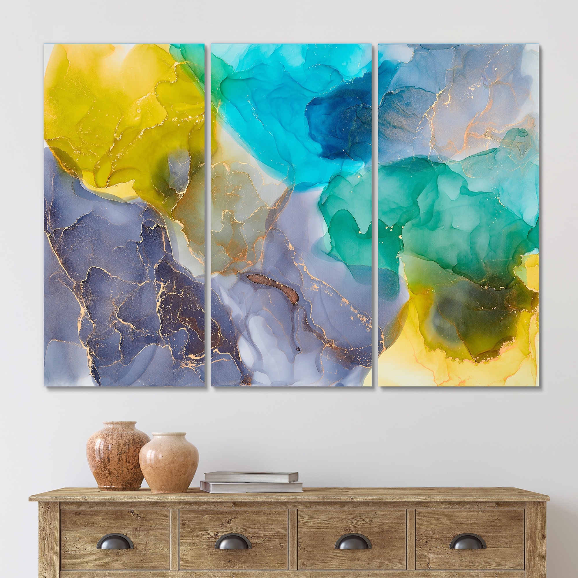 Designart "Turquoise And Yellow Luxury Abstract Fluid Art" Modern Canvas Wall Art Print