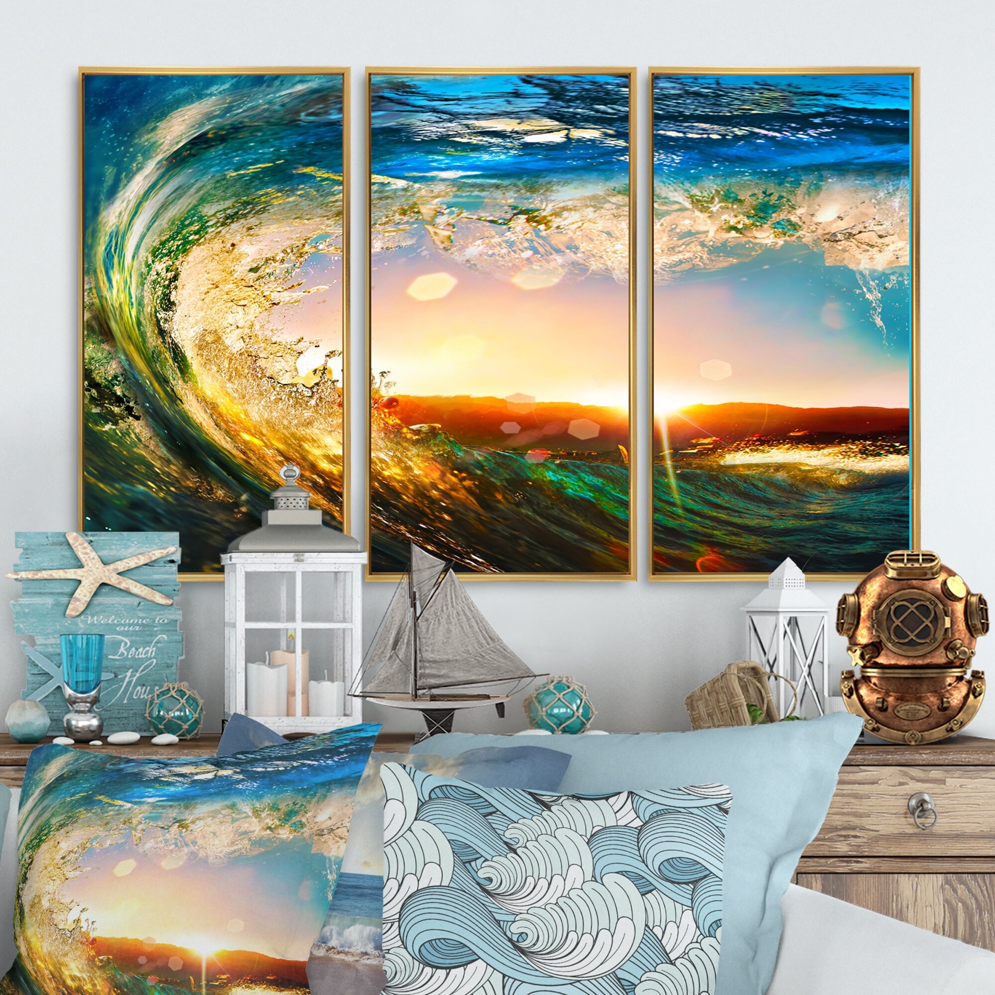 Designart "Colored Ocean Waves Falling Down" Sea & Shore Framed Art Set of 3 - 4 Colors of Frames