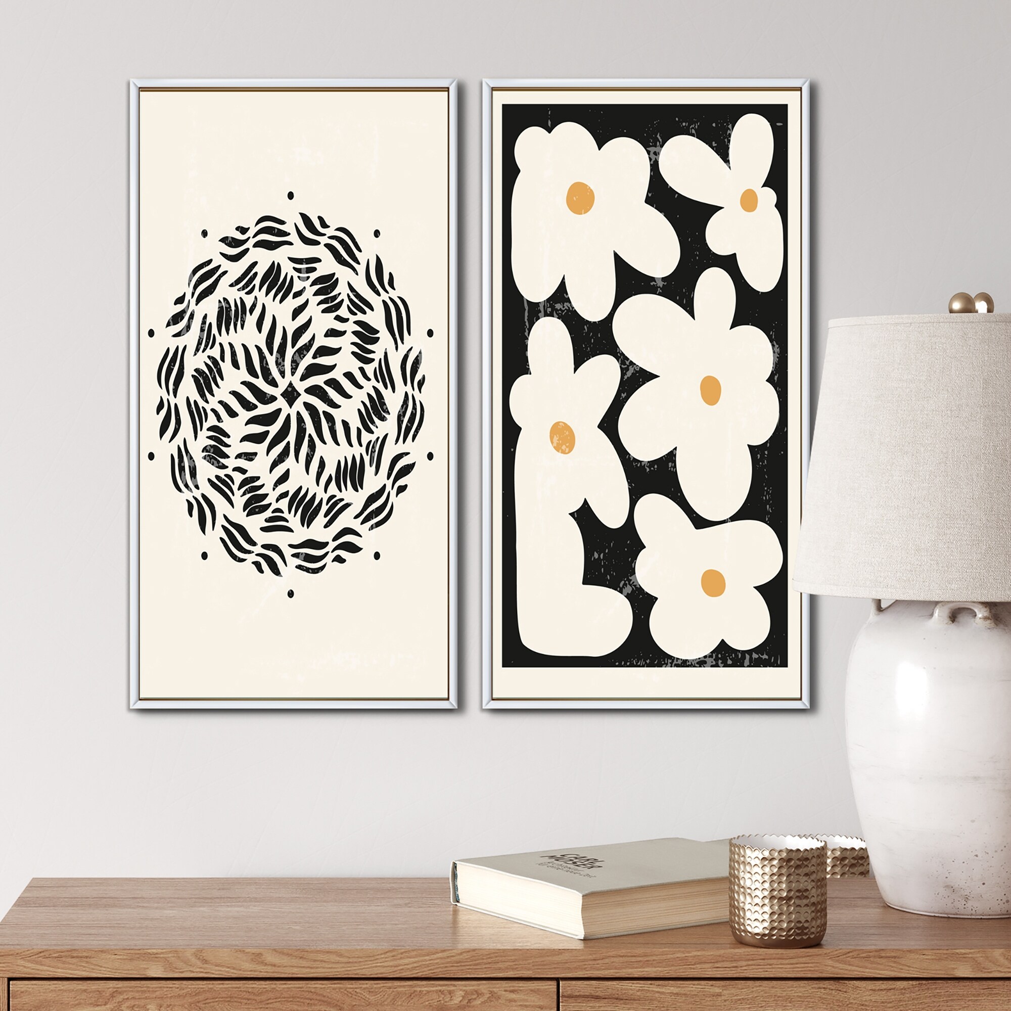 Designart "Minimal Retro Flowers I" Floral Framed Art Set of 2 Pieces