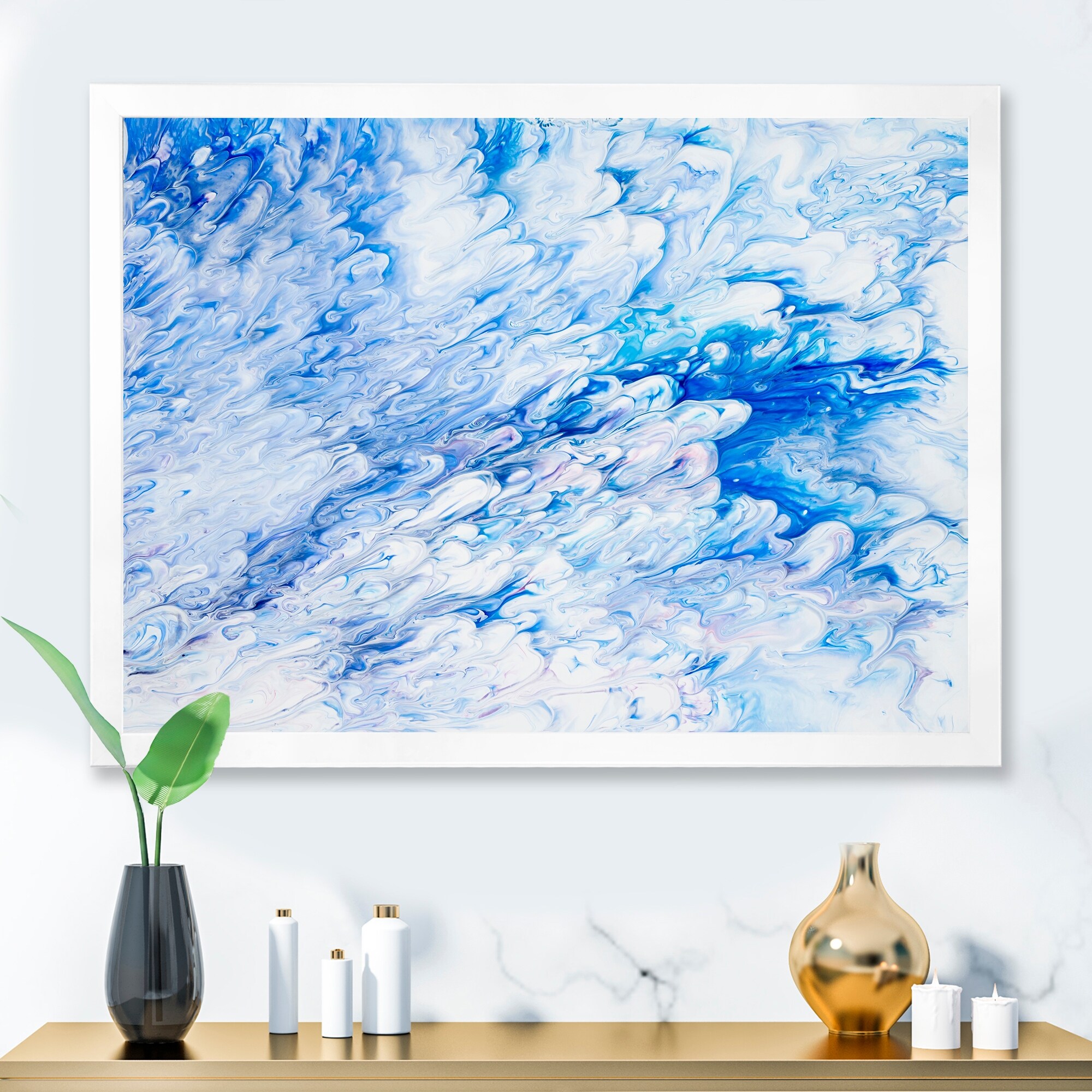 Designart "Blue And White Liquid Marble Art" Modern Framed Art Print