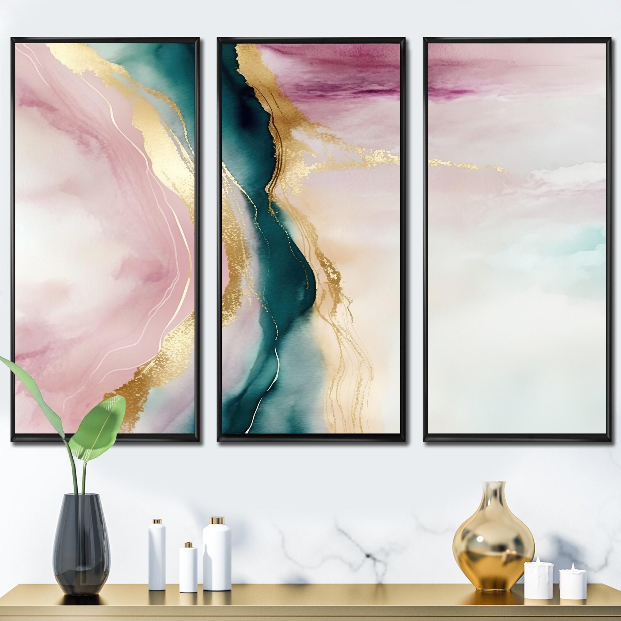 Designart "Abstract Geode Pink And Green Marble IV" Abstract Marble Framed Canvas Art Print - 3 Panels