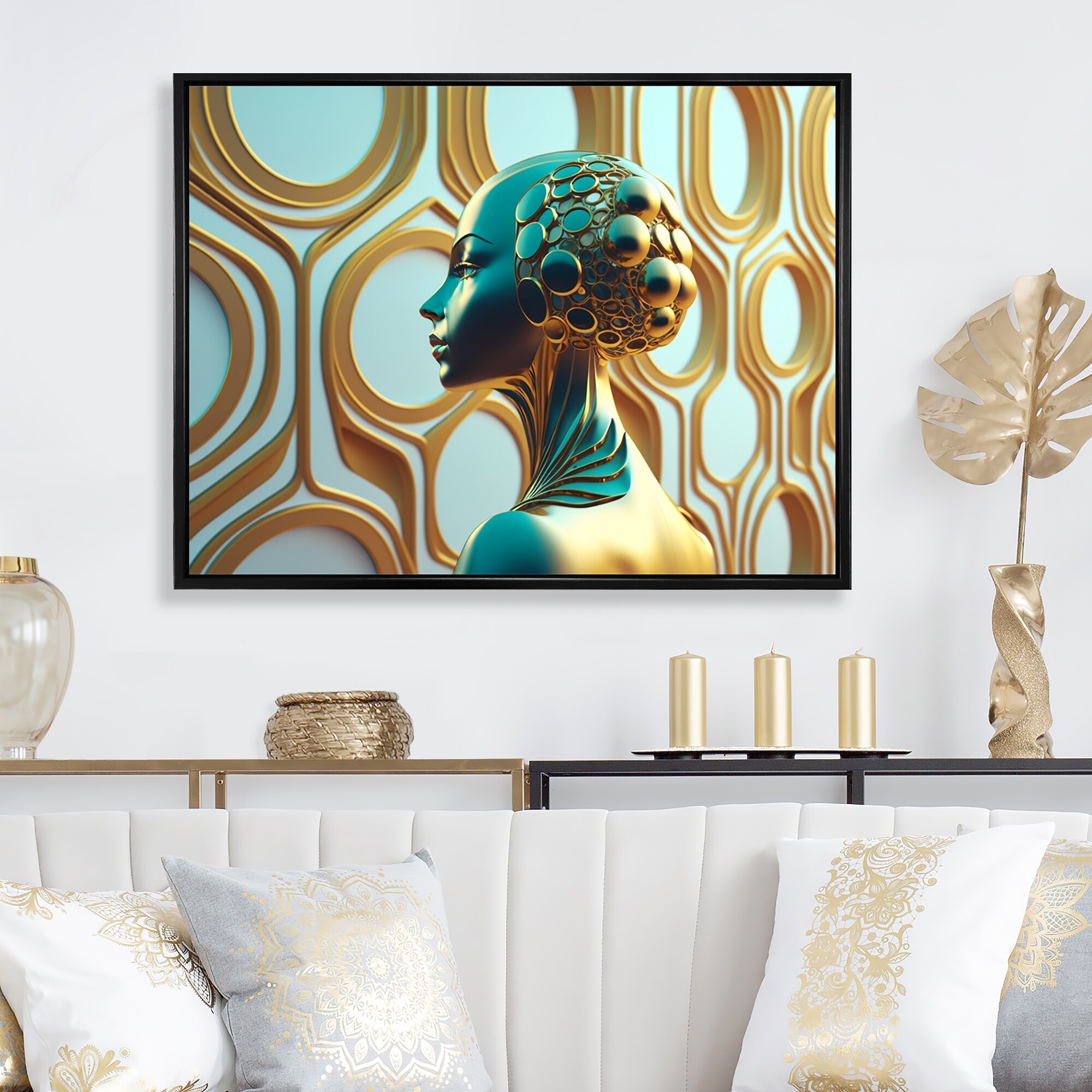 Designart "Visionary Gold And Turquoise Goddess I" Modern Woman Framed Canvas Wall Art Print