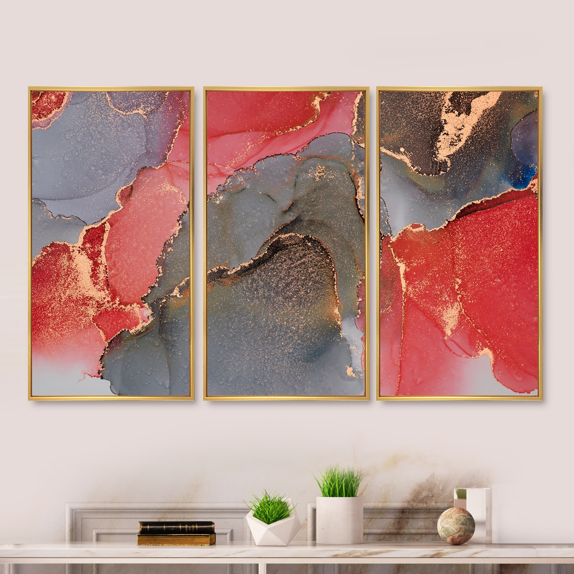 Designart "Grey And Red Luxury Abstract Fluid Art" Modern Framed Wall Art Set of 3 - 4 Colors of Frames