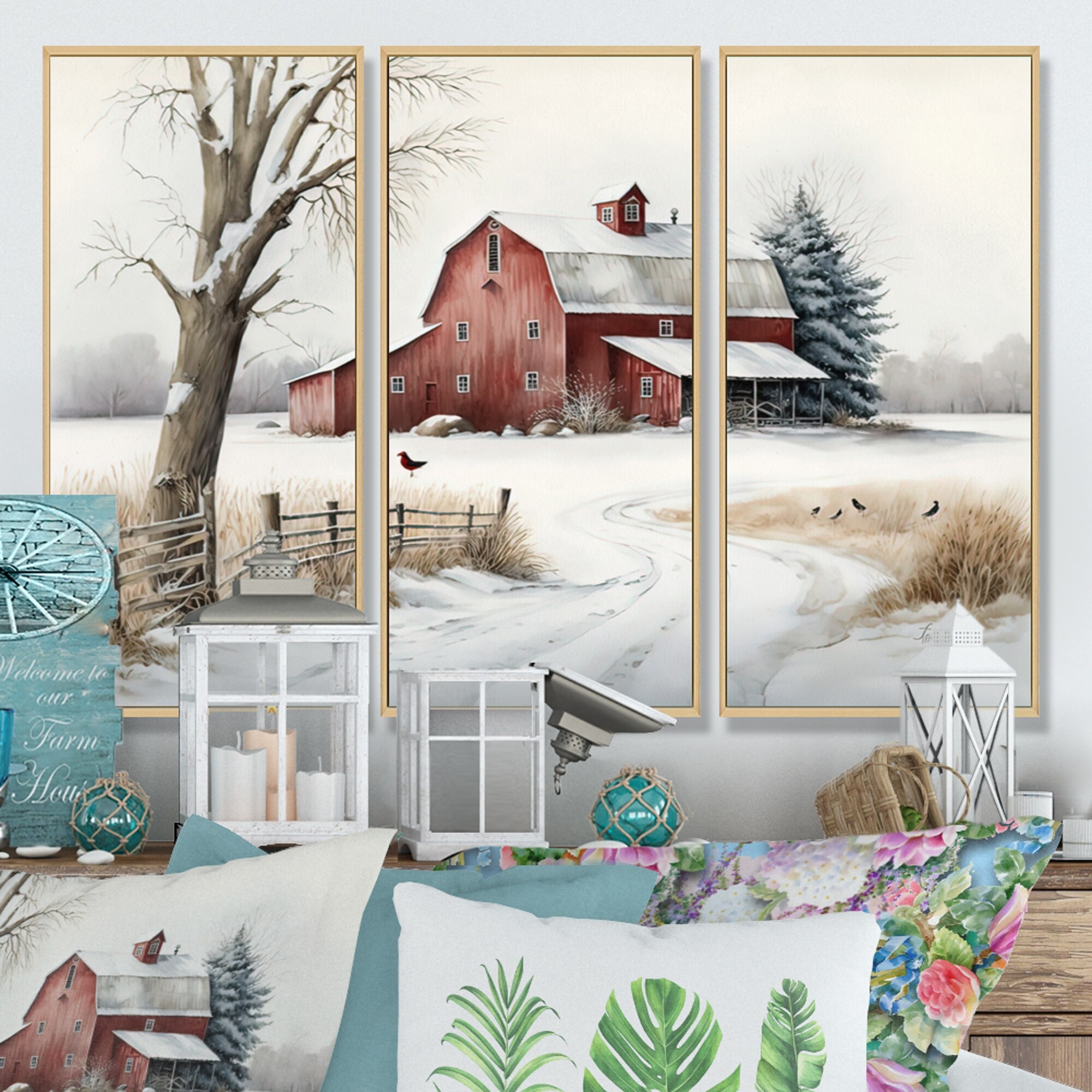 Designart "Calm Red Barn in Winter III" Farmhouse / Country Framed Canvas Art Print - 3 Panels