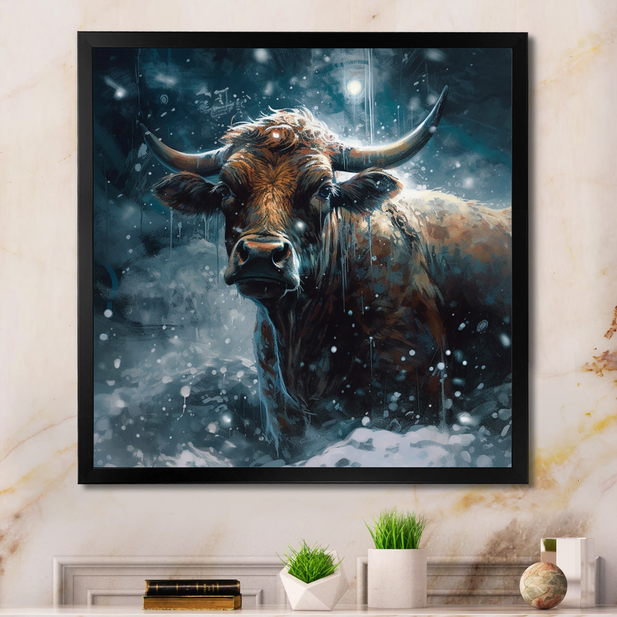 Designart "Cow In the Snow I" Animals Cow Framed Canvas Art Print