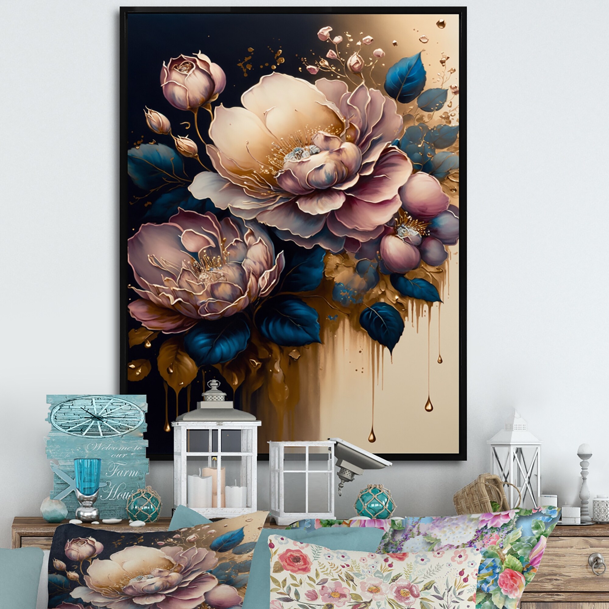 Designart "Decadent Pink And Blue Roses IV" Floral & Botanical Framed Canvas Art Print