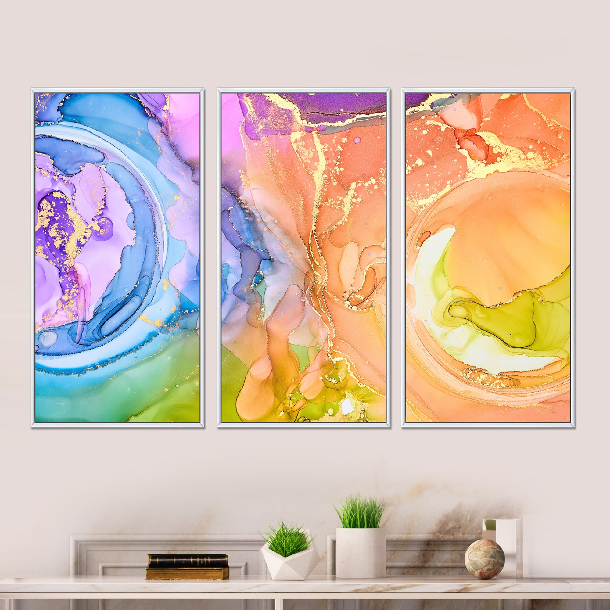 Designart "Turquoise And Purple Luxury Abstract Fluid Art I" Modern Framed Artwork Set of 3 - 4 Colors of Frames