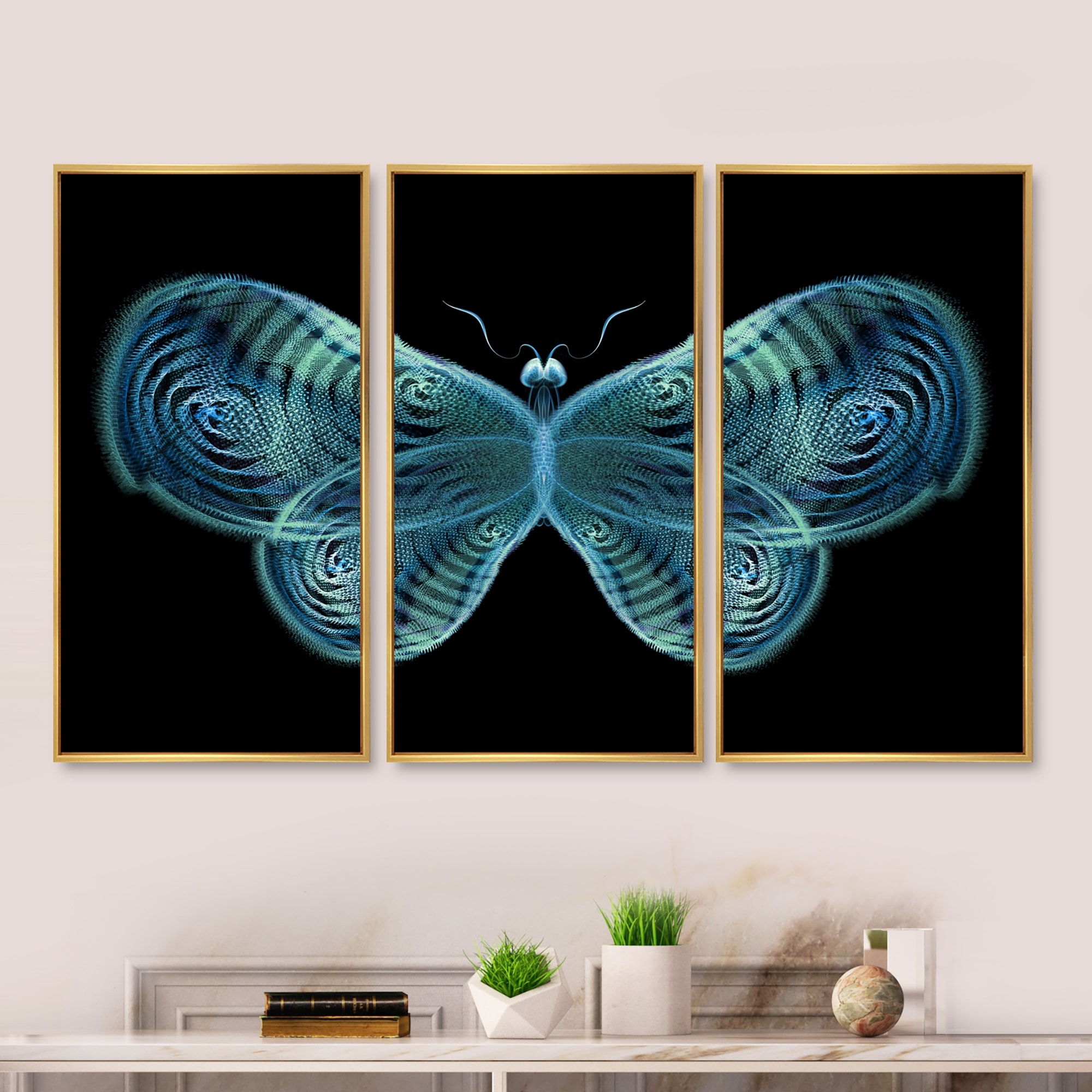 Designart "Light Blue Fractal Butterfly in Dark" Floral Framed Artwork Set of 3 - 4 Colors of Frames