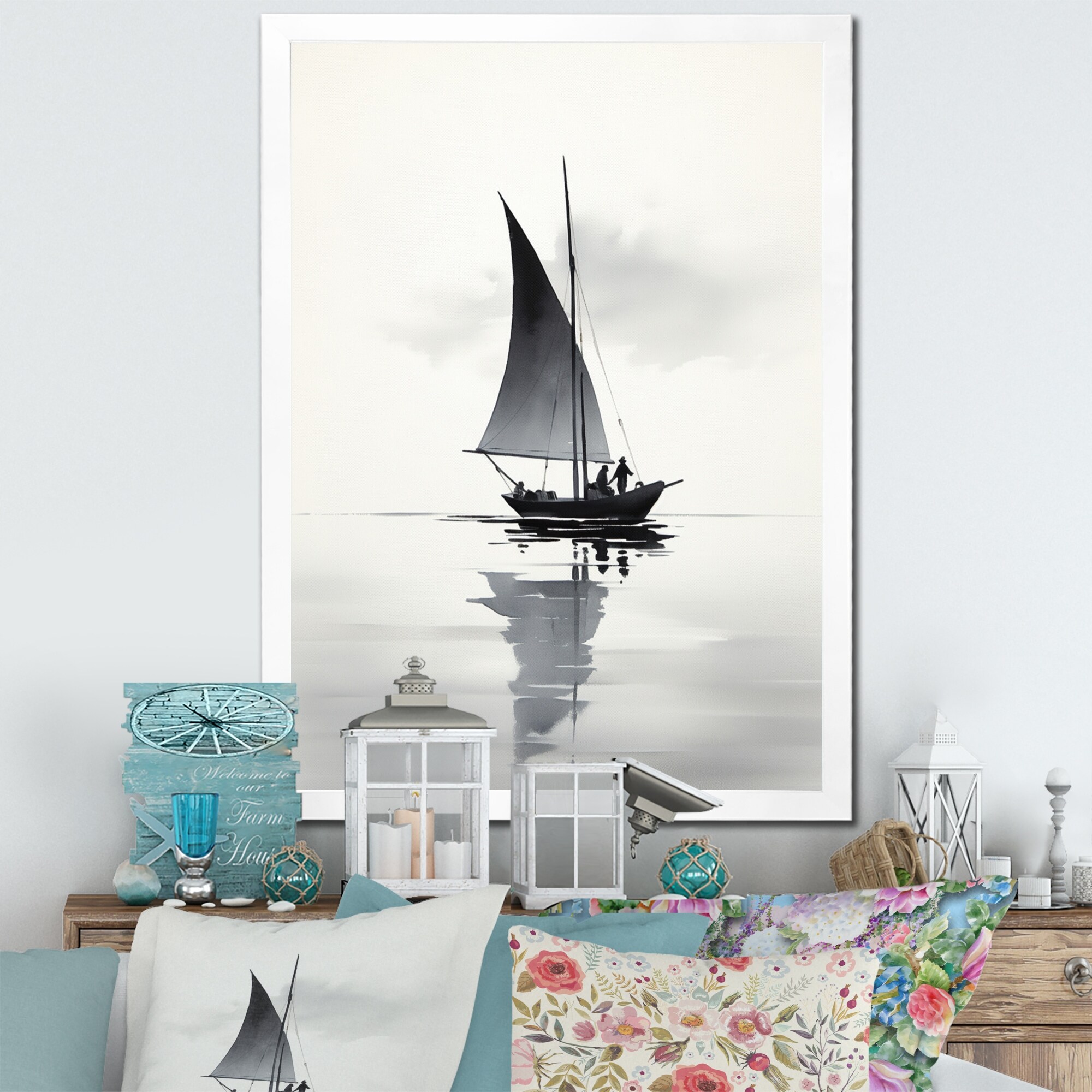 Designart "Asian Art Sailboat Sumi II" Asian Art Framed Wall Art Living Room
