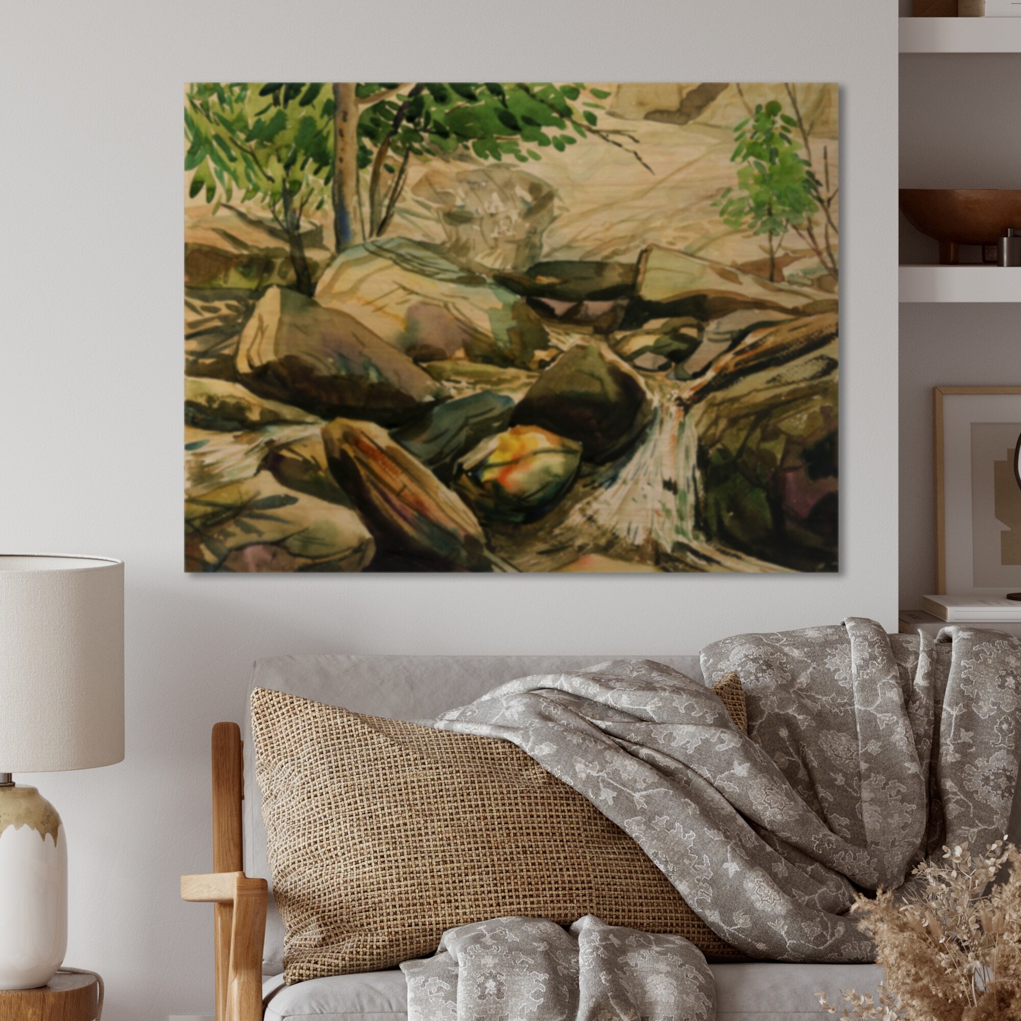Designart 'Asian Sunshine on Stone And River' Traditional Wood Wall Art Panels - Natural Pine Wood