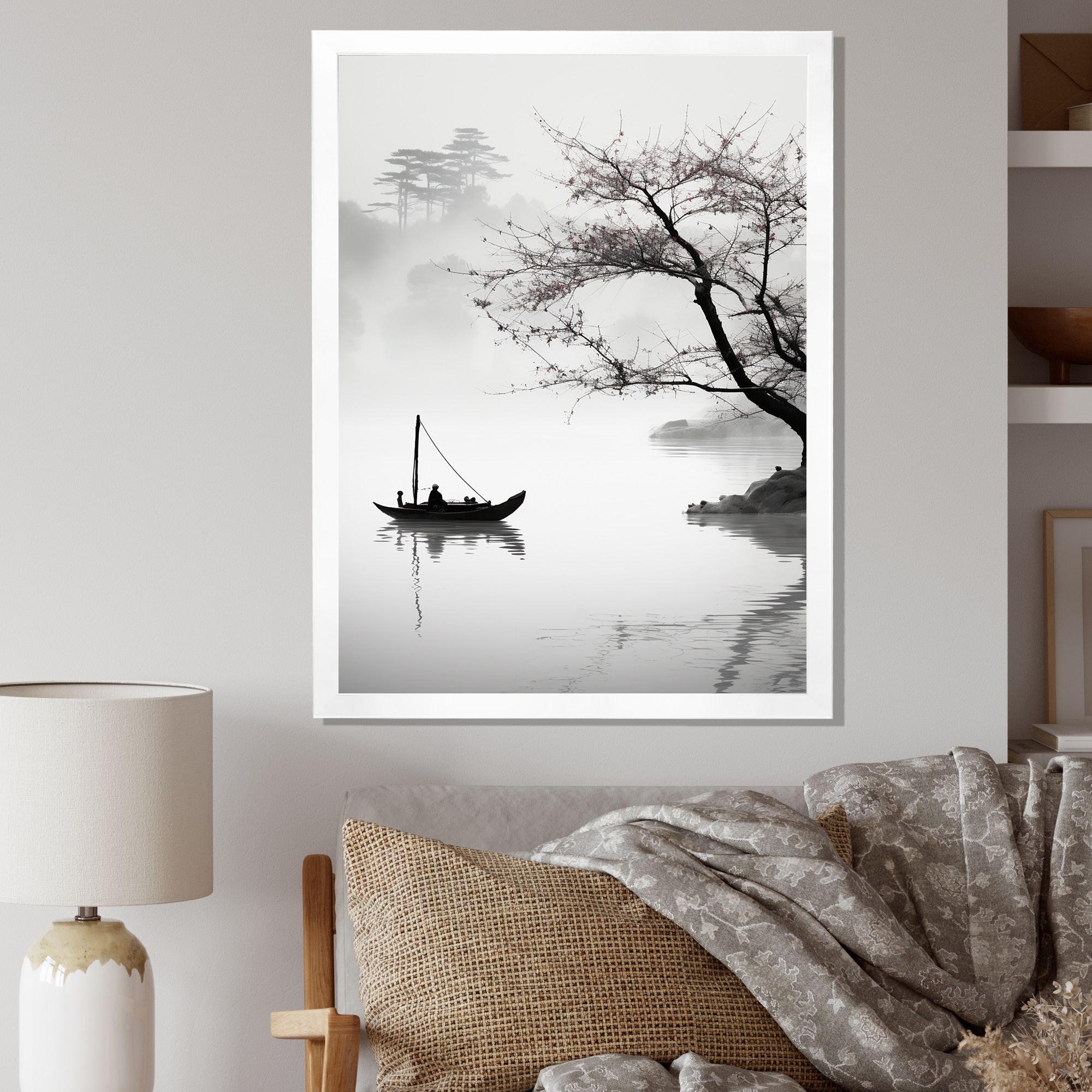 Designart "Asian Art Boat Monochrome" Asian Art Framed Canvas Wall Art