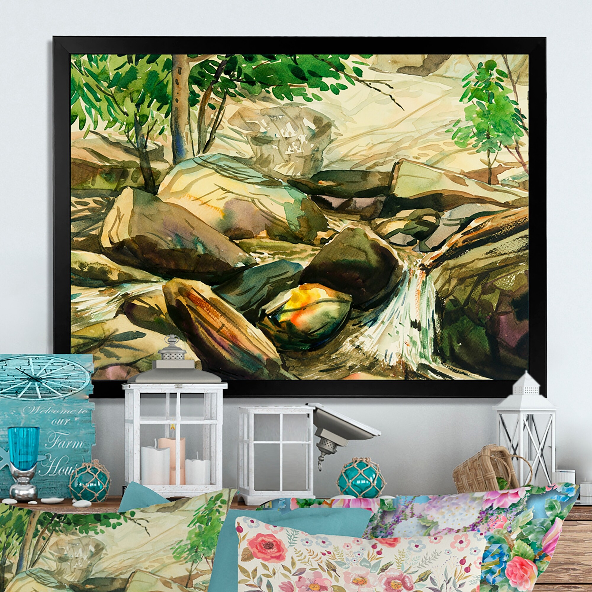 Designart "Asian Sunshine on Stone And River" Traditional Framed Art Print