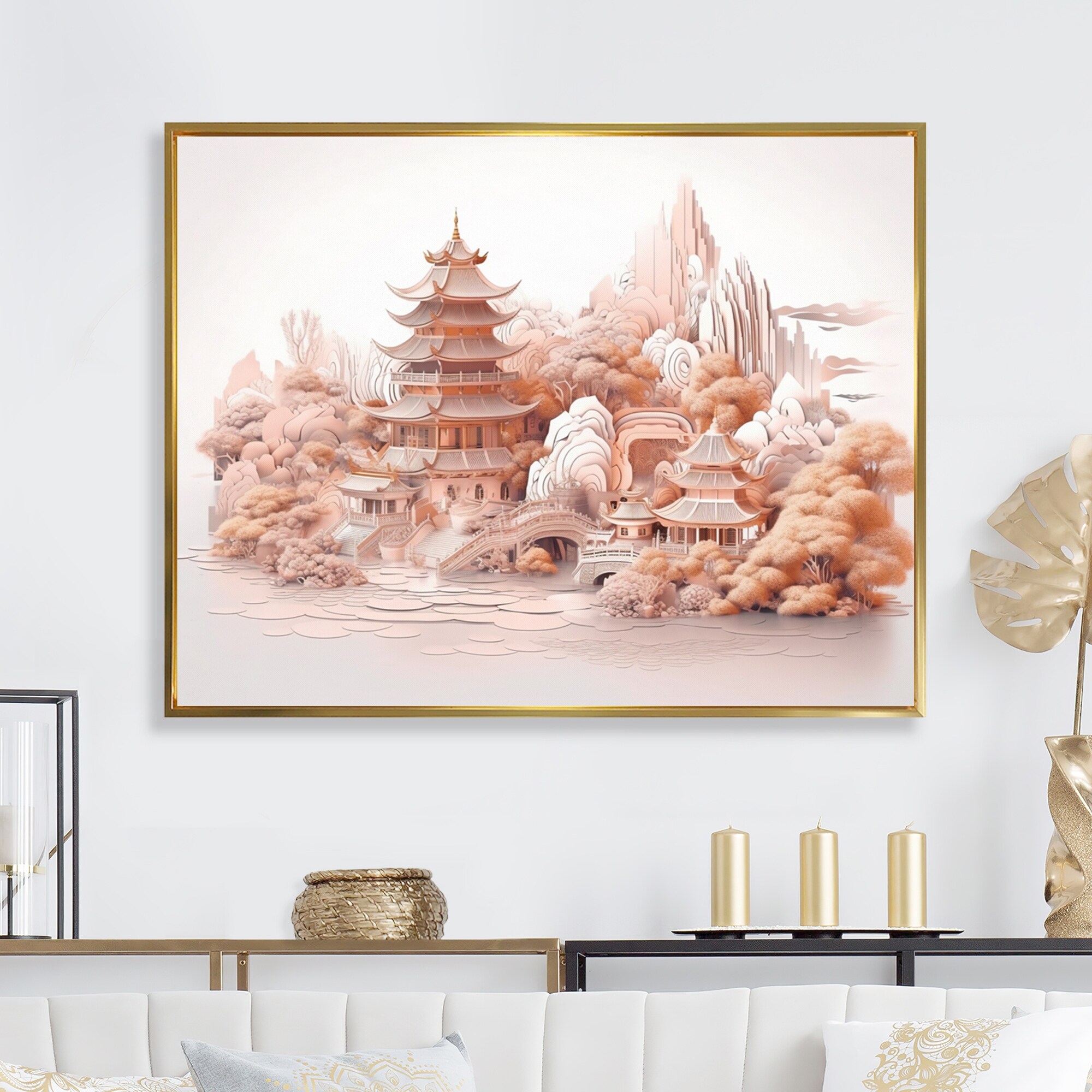 Designart "Asian Mountain And Lake Illustration I" Japon Landscape Framed Canvas Art Print