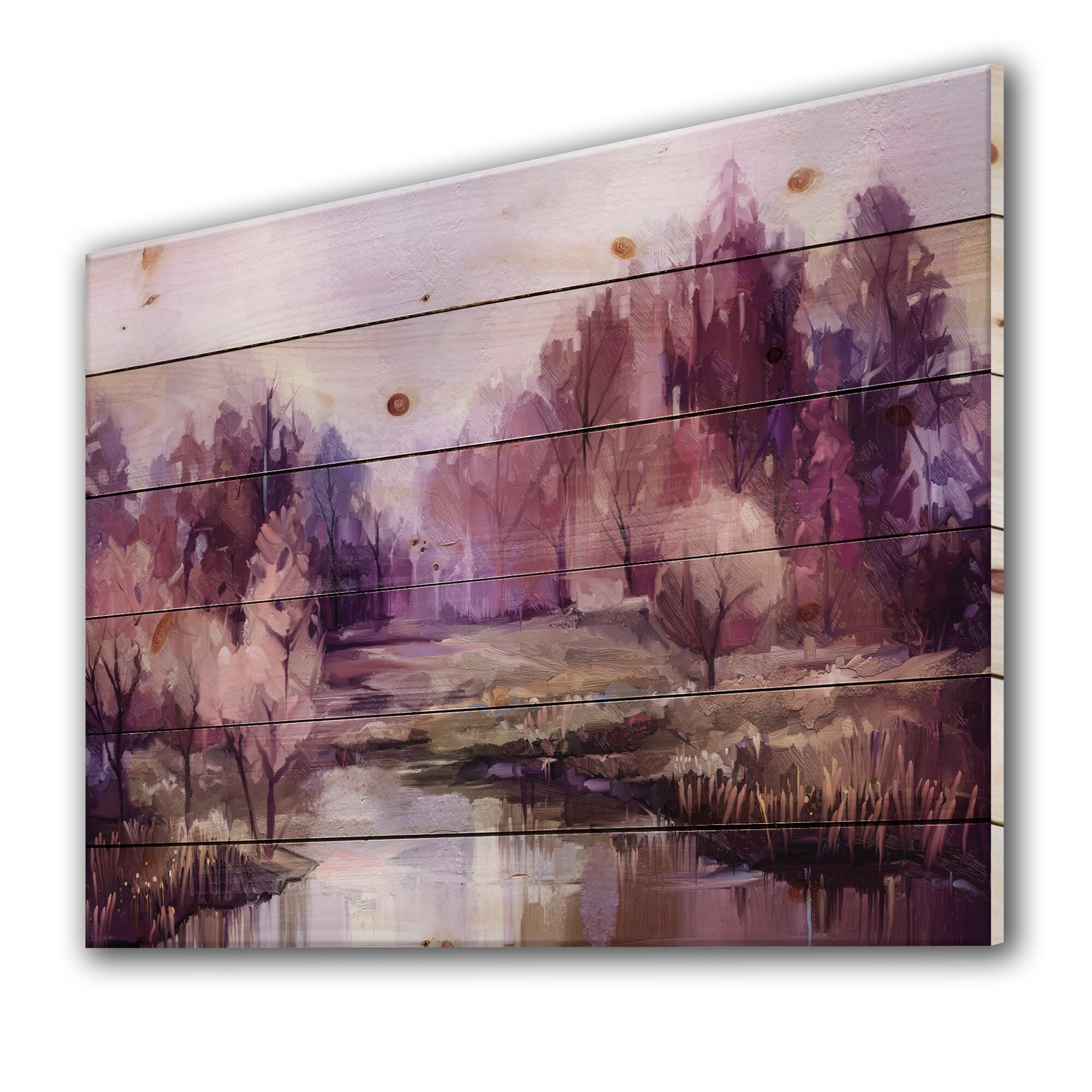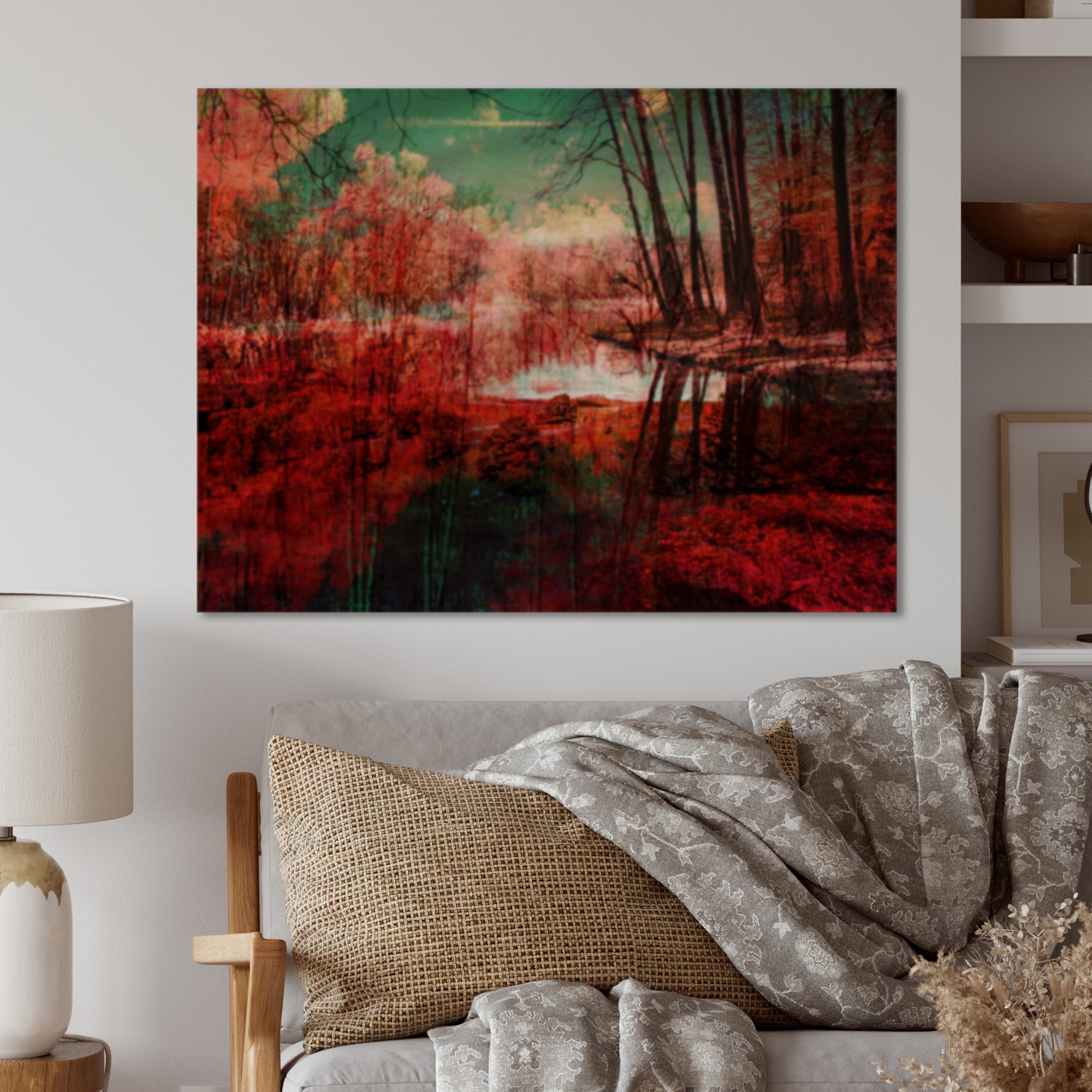 Designart 'Red Autumn Artistic Forest By the Lake' Traditional Wood Wall Art Décor - Natural Pine Wood