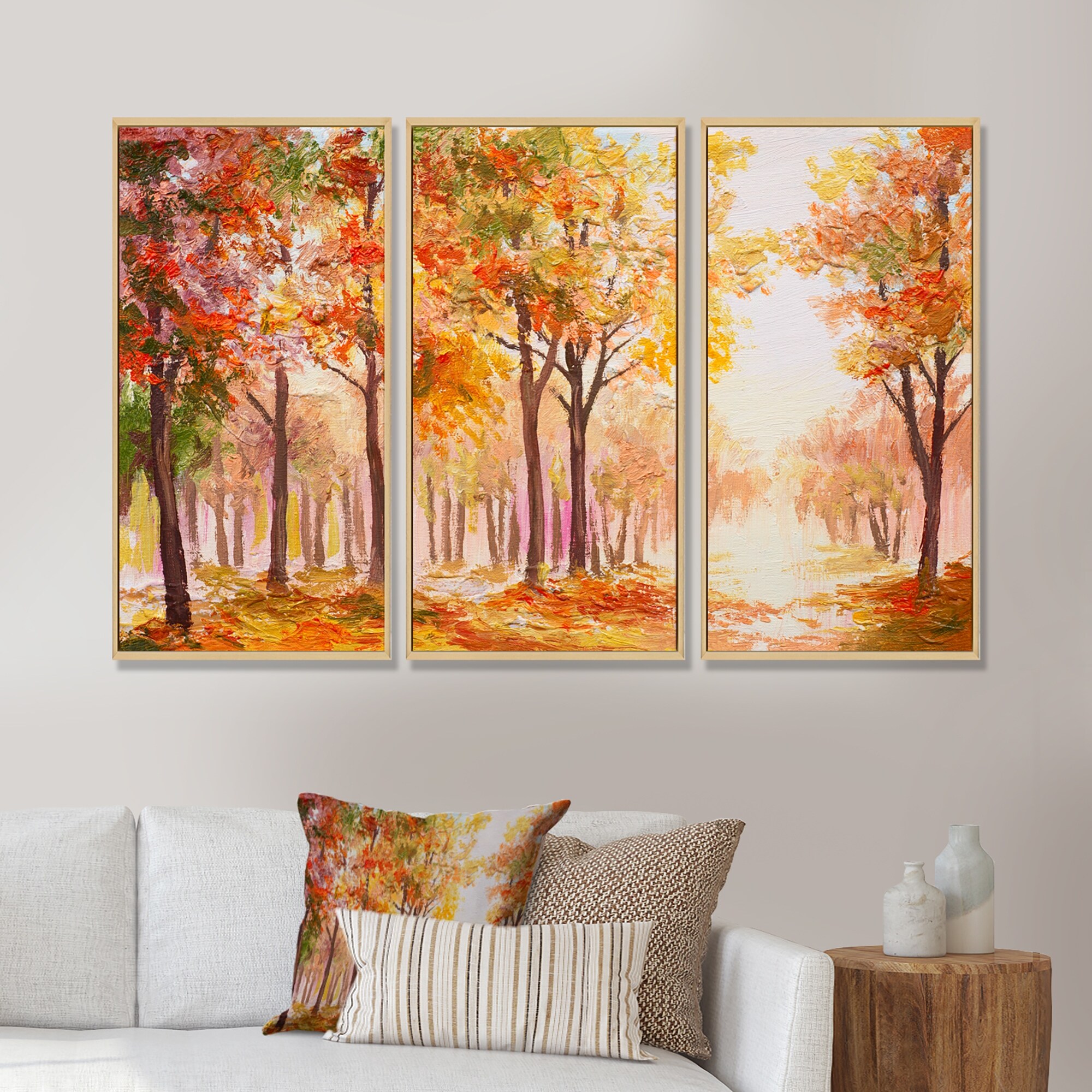 Designart "Autumn Everywhere Forest" Landscape Framed Canvas Wall Art Set of 3 - 4 Colors of Frames