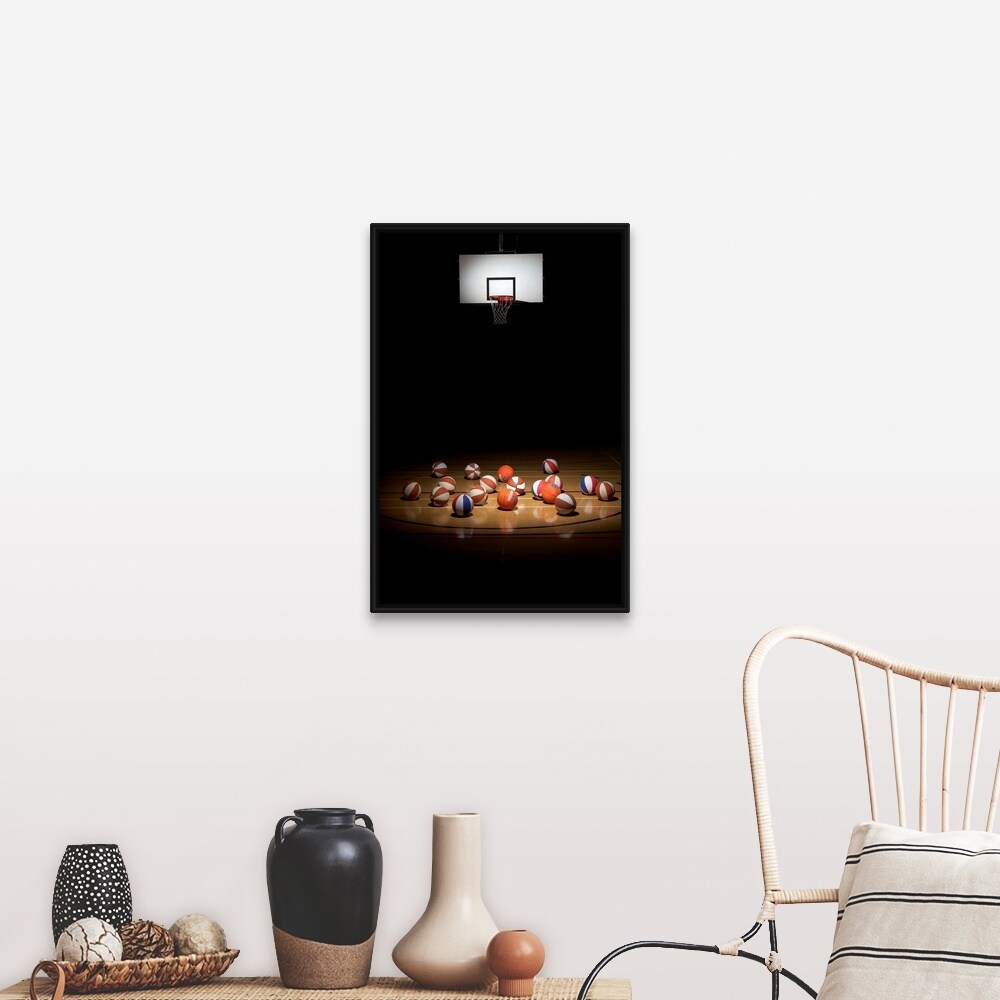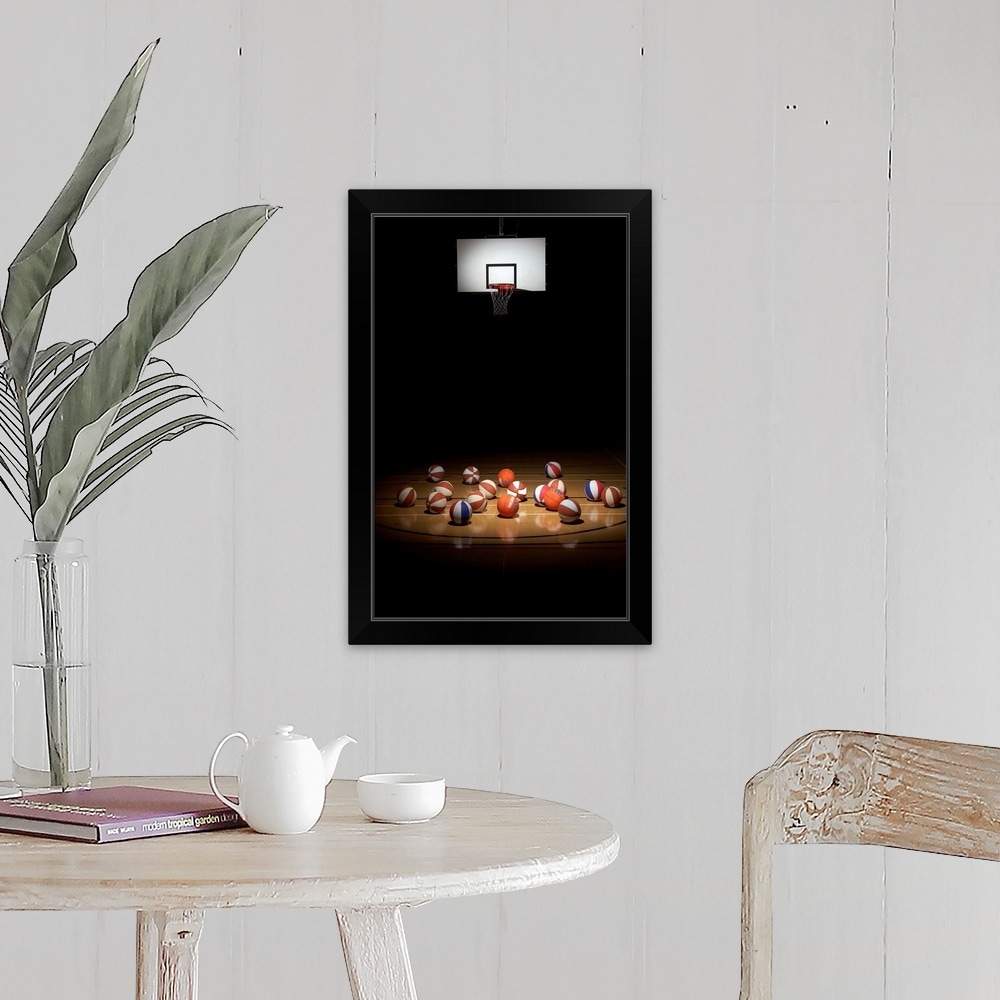 "Many basketballs resting on the floor" Black Float Frame Canvas Art