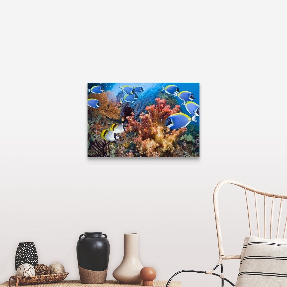 "Powder-blue surgeonfish over corals" Canvas Wall Art