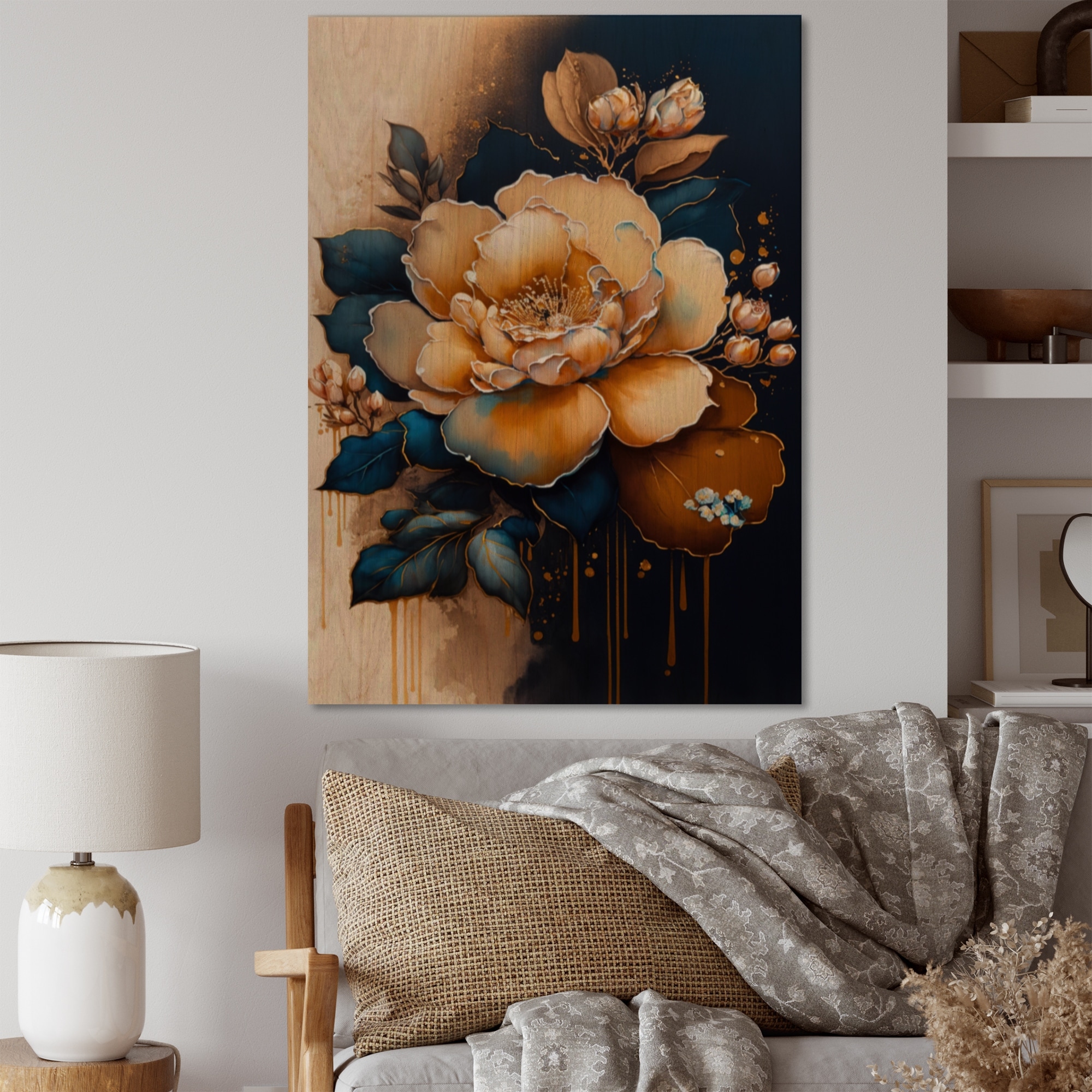 Designart 'Yellow And Dark Blue Camellia Flower II' Floral Camellia Wood Wall Art - Natural Pine Wood