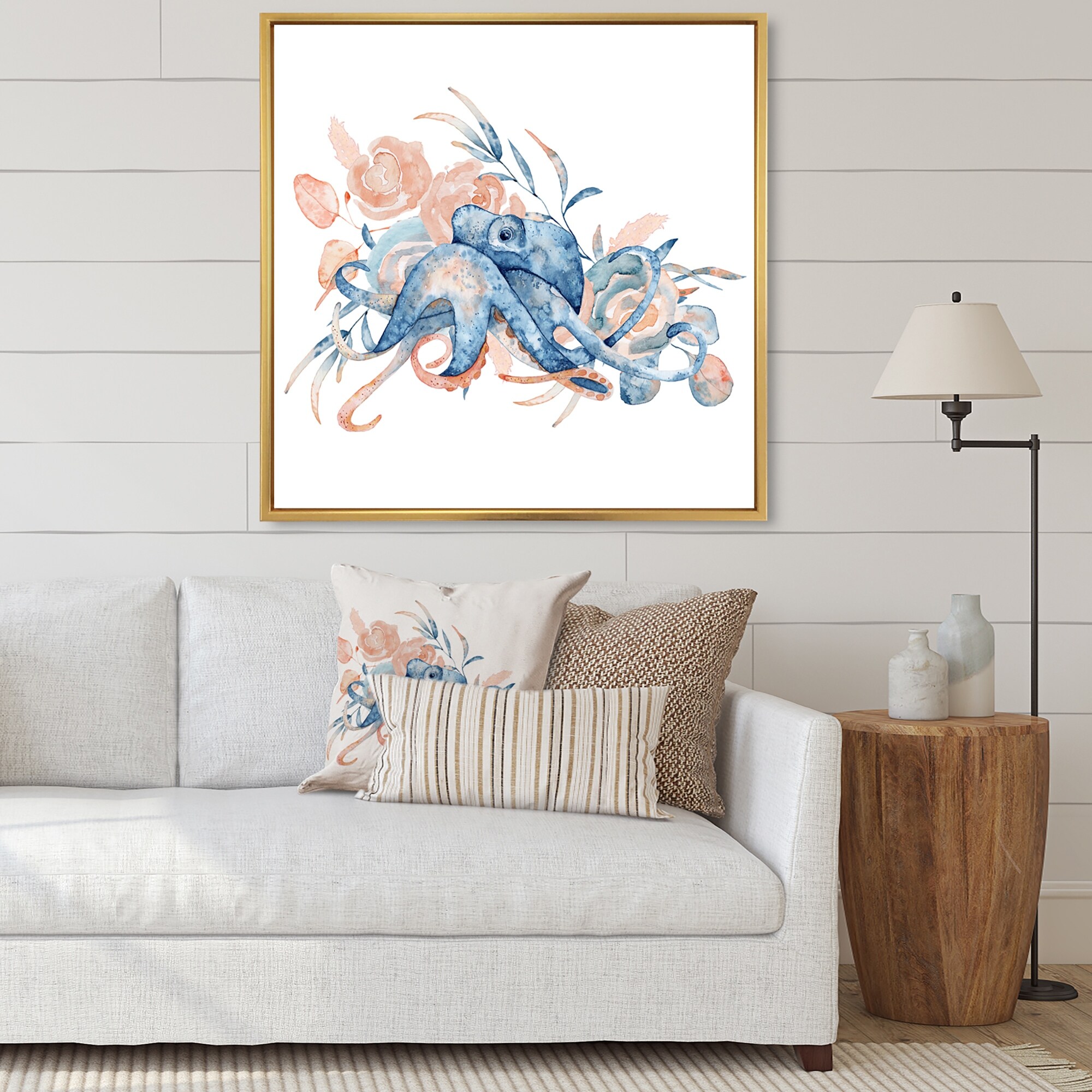 Designart "Blue Octopus With Pink Flowers" Nautical & Coastal Framed Canvas Wall Art Print