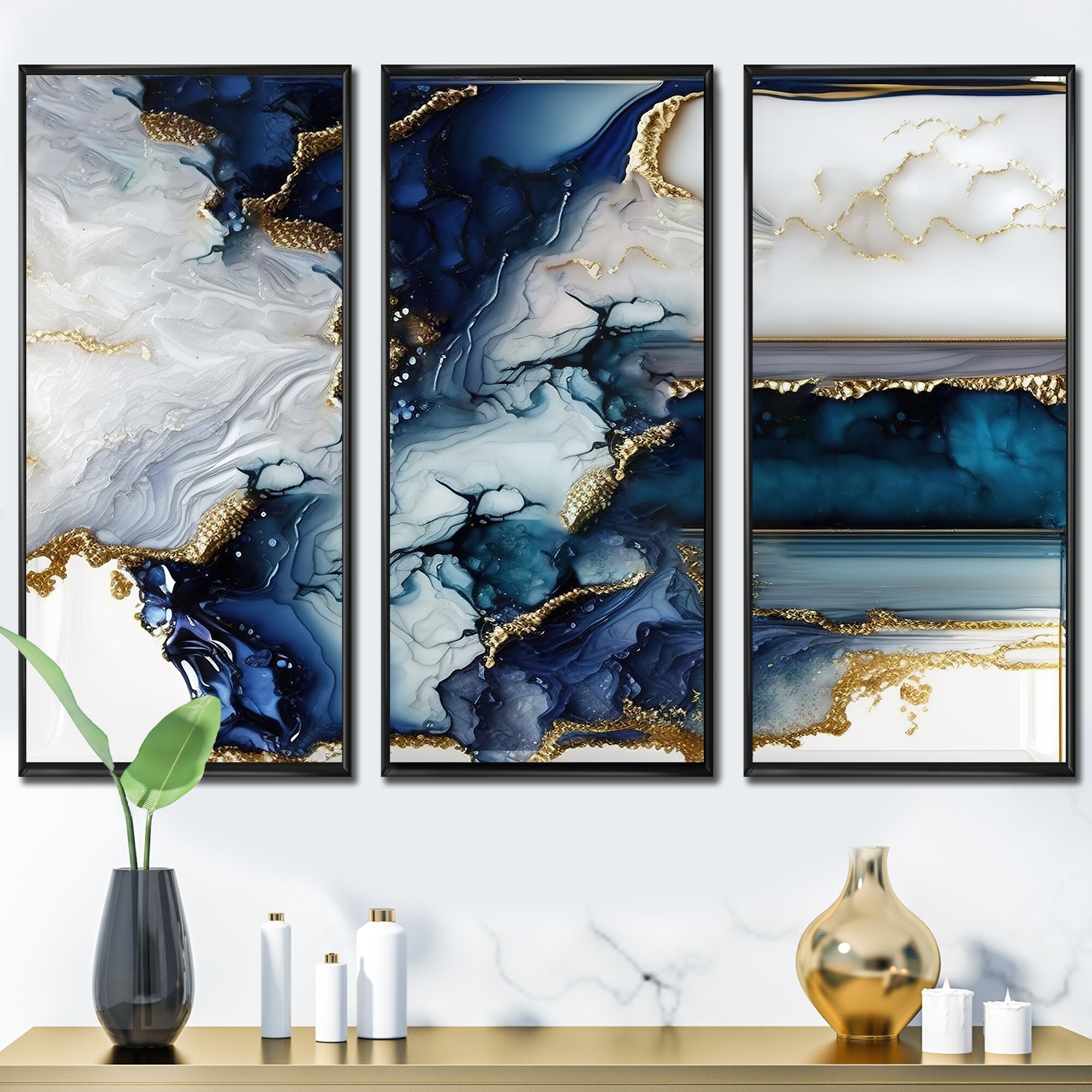 Designart "Abstract Geode White And Blue Marble I" Abstract Marble Framed Canvas Art Print - 3 Panels