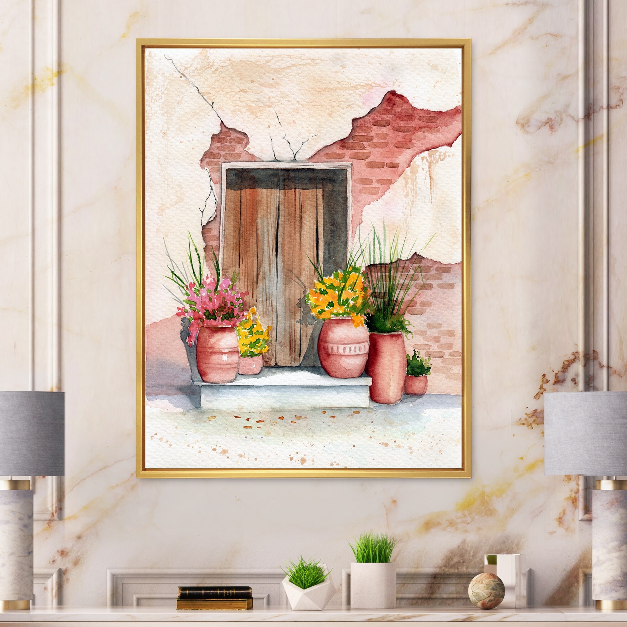 Designart "Old Wooden Door Brick Wall And Some Plants I" Vintage Framed Canvas Wall Art Print
