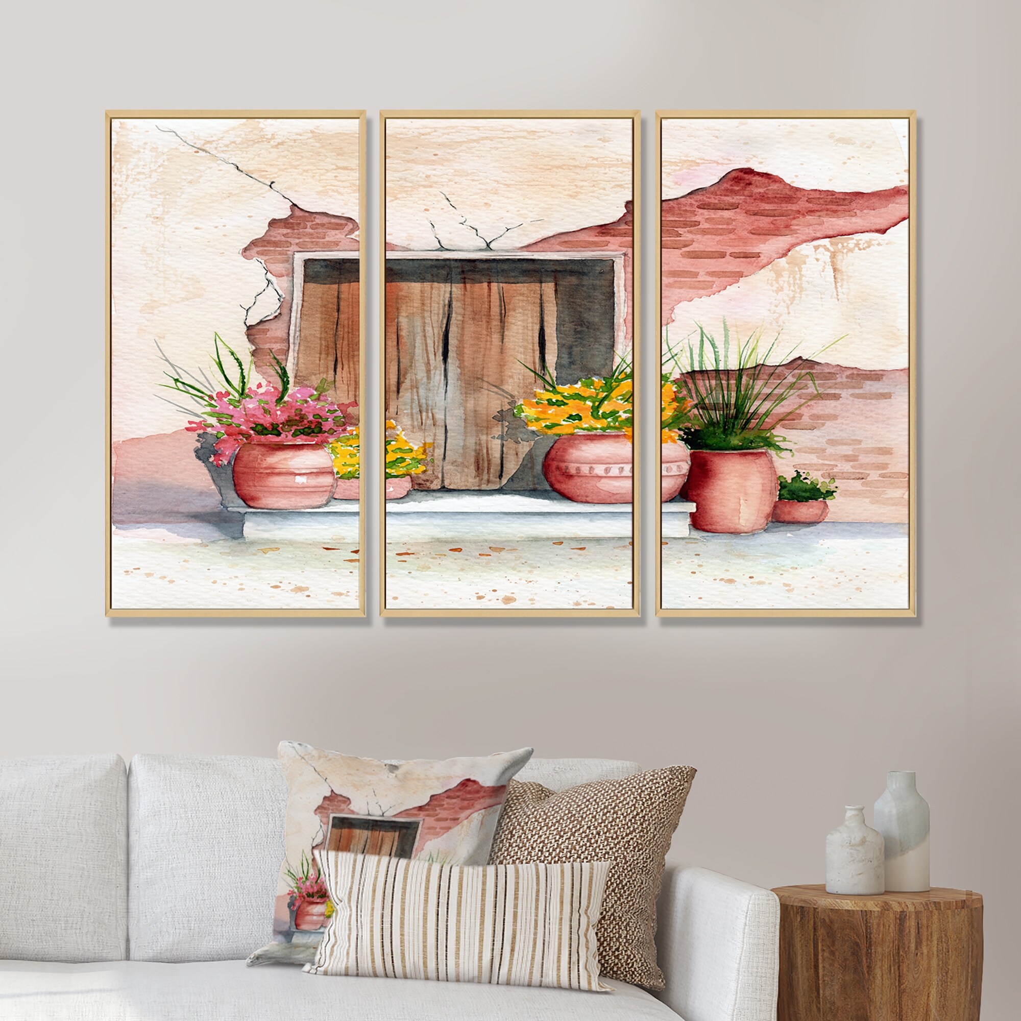Designart "Old Wooden Door Brick Wall And Some Plants I" Vintage Framed Canvas Wall Art Set of 3 - 4 Colors of Frames