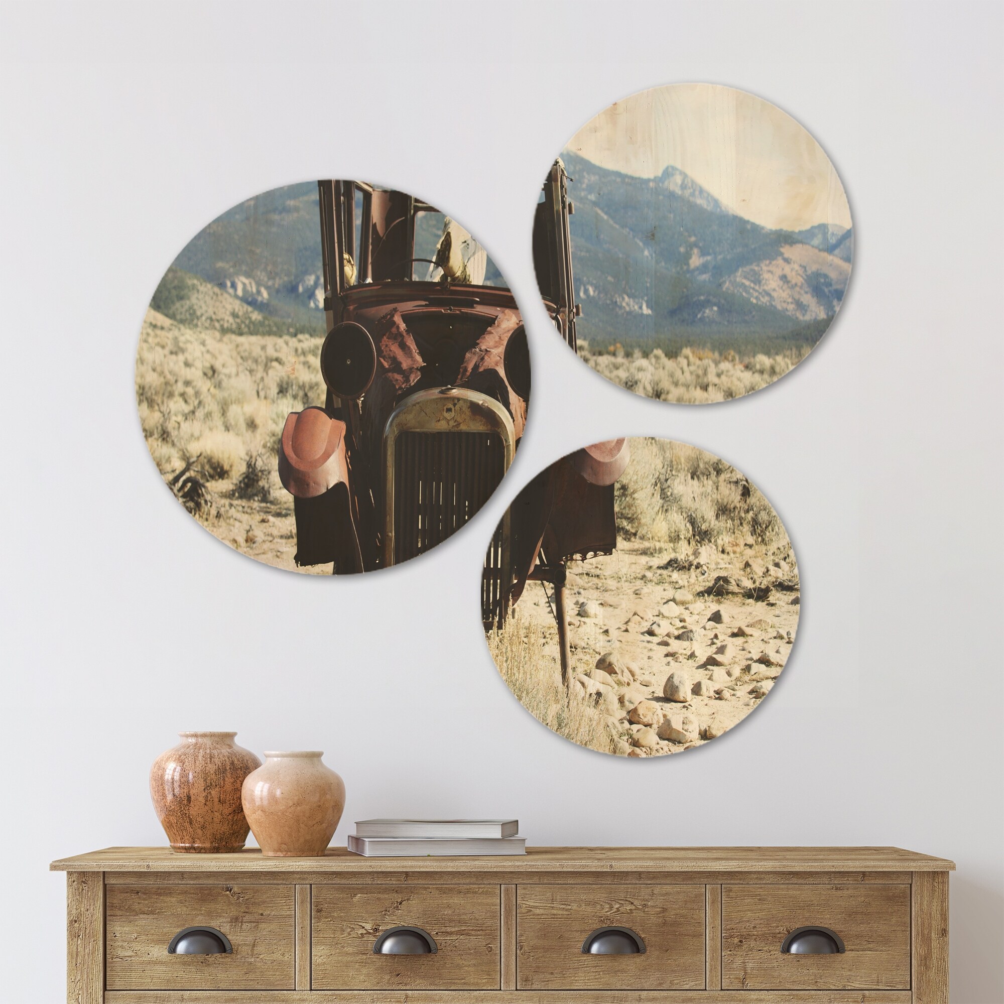 Designart 'Retro Car in Mountainous Area' Landscape Wood Wall Art Set of 3 Circles