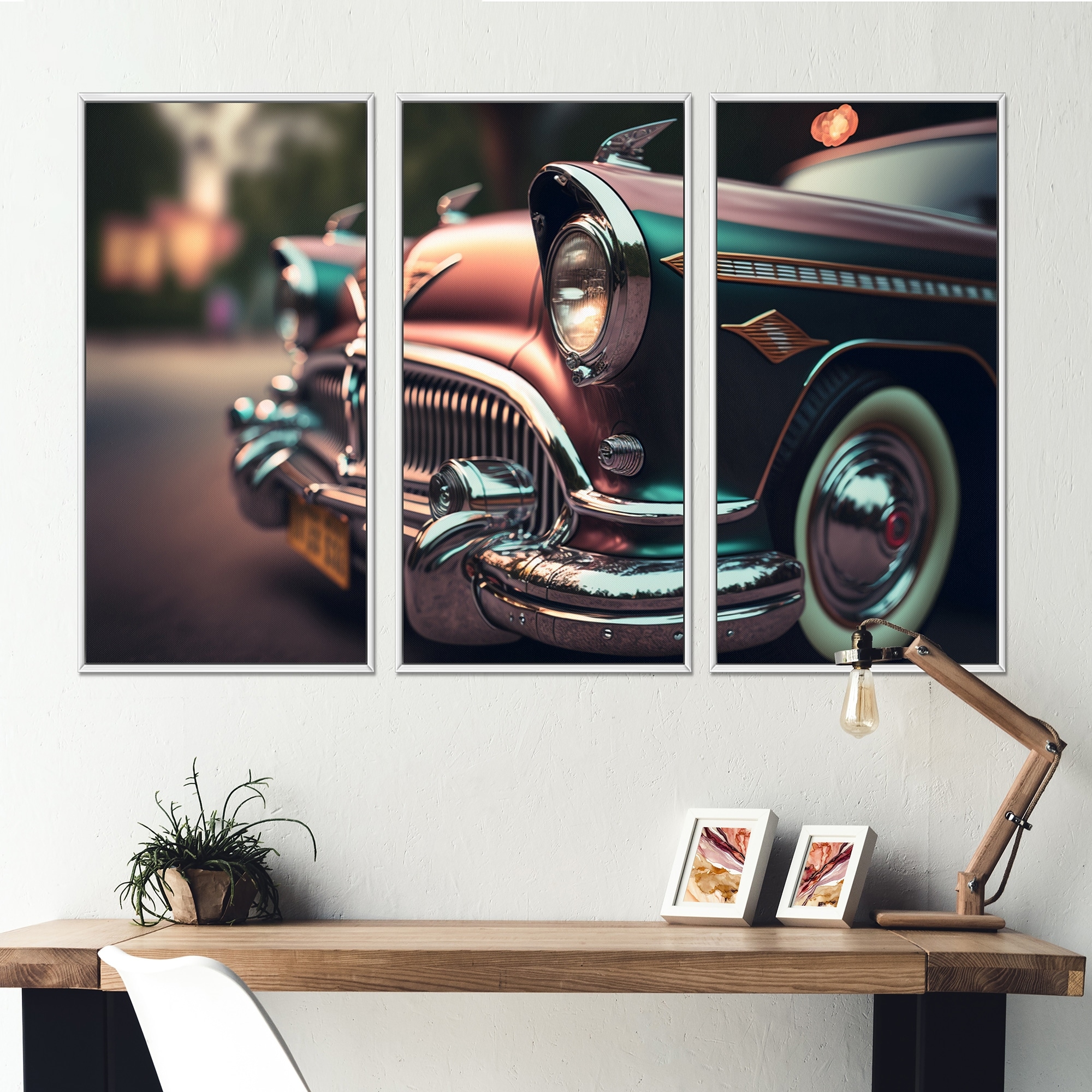 Designart "Close-up Of Classic Retro Car V" Retro Car Framed Canvas Wall Art Print - 3 Panels