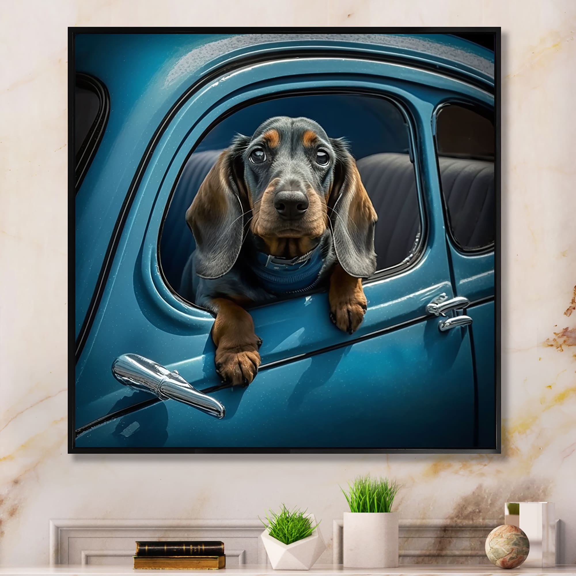 Designart "Portrait Of a Dachshund in A Blue Car II" Animals Framed Canvas Wall Art Print