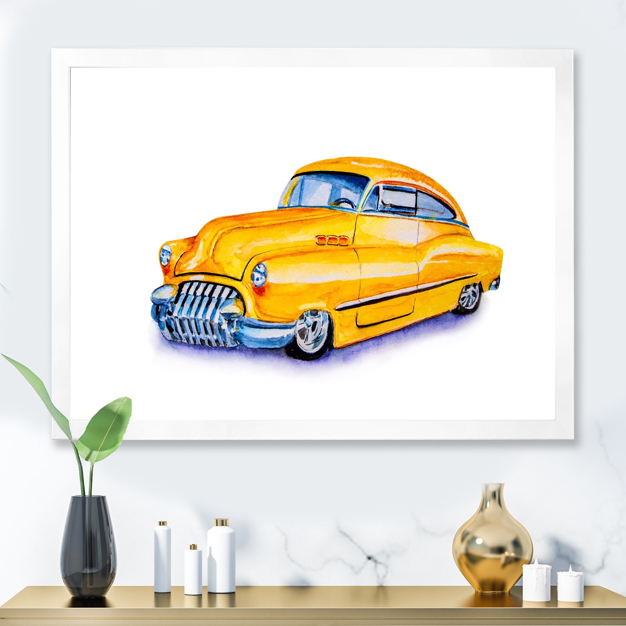 Designart "Yellow And Black Artistic Tributes to Retro Cars" Retro Car Framed Canvas Print