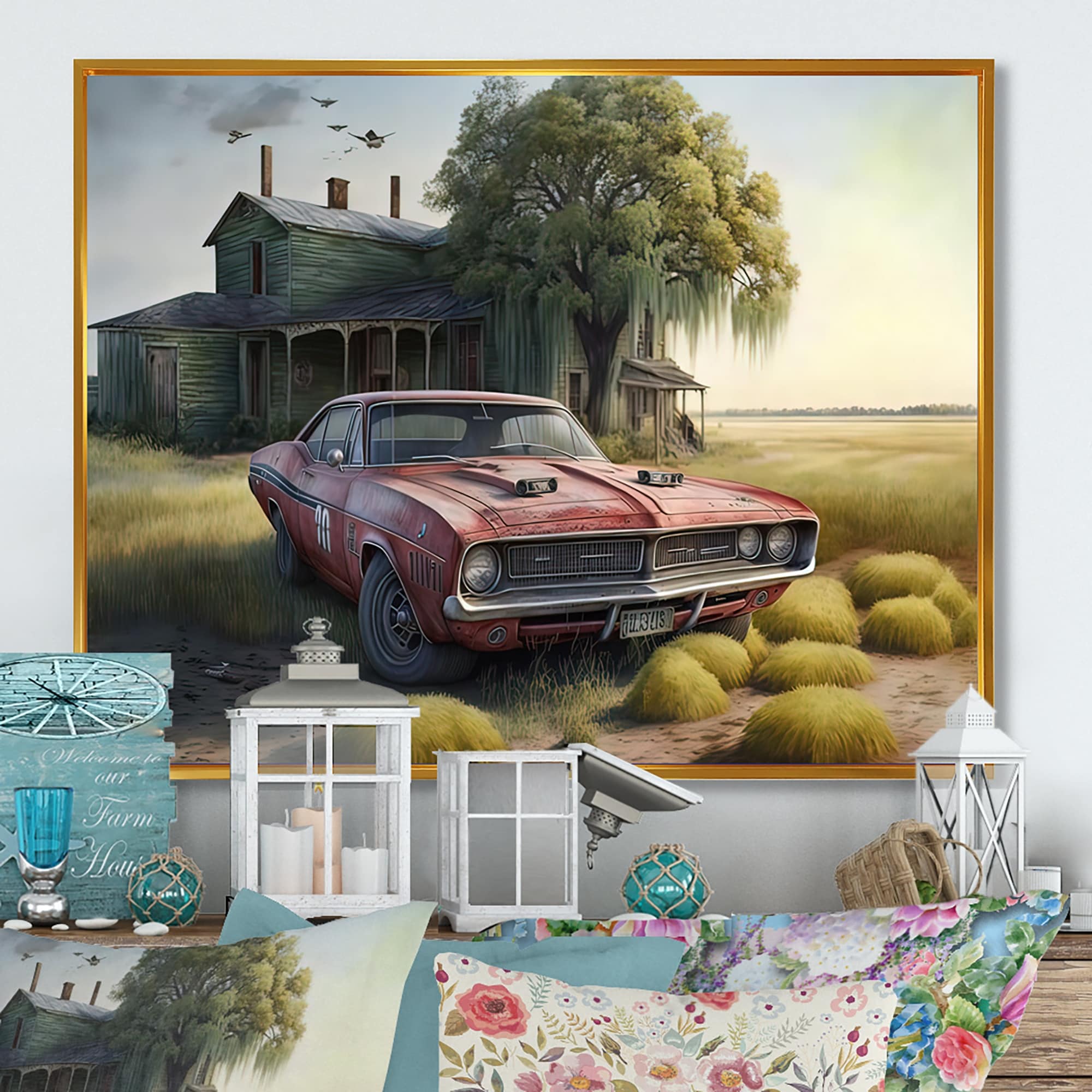 Designart "Orange Muscle Car At the Barn" Farmhouse / Country Framed Canvas Art Print