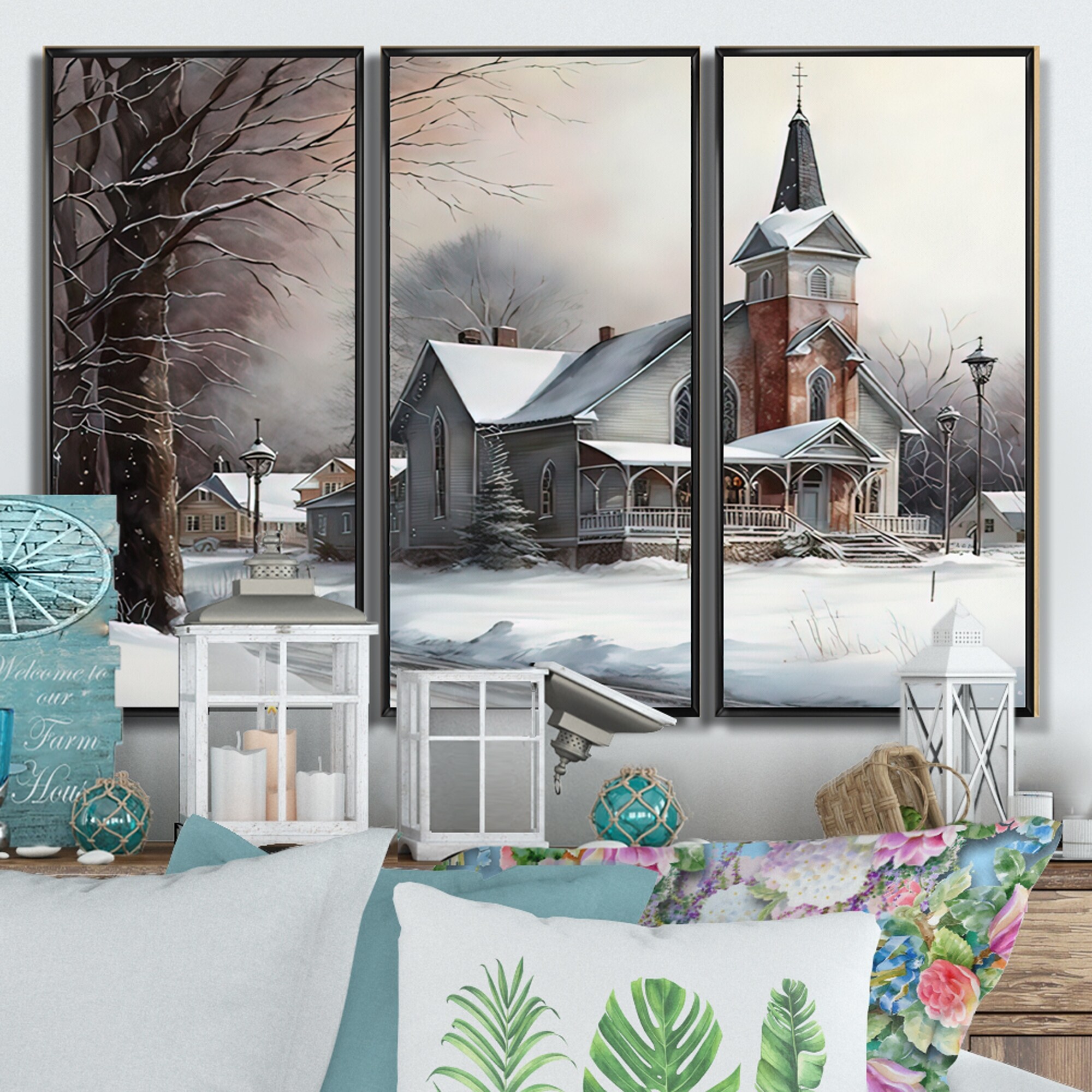 Designart "Church In Country During Winter V" Landscape Church Framed Canvas Art Print - 3 Panels