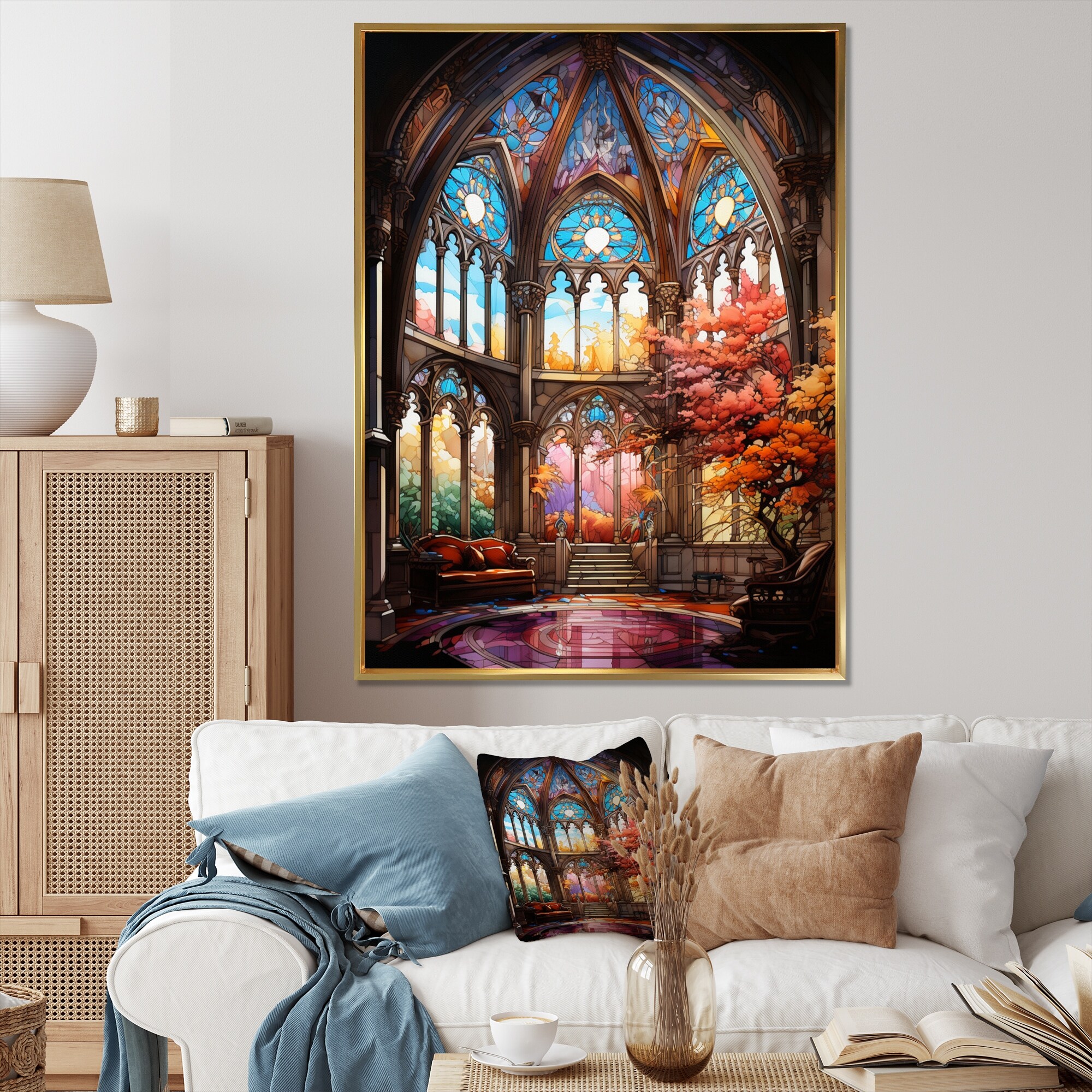Designart "Church Stained Glass Windows II" Landscape Church Framed Canvas Art Print