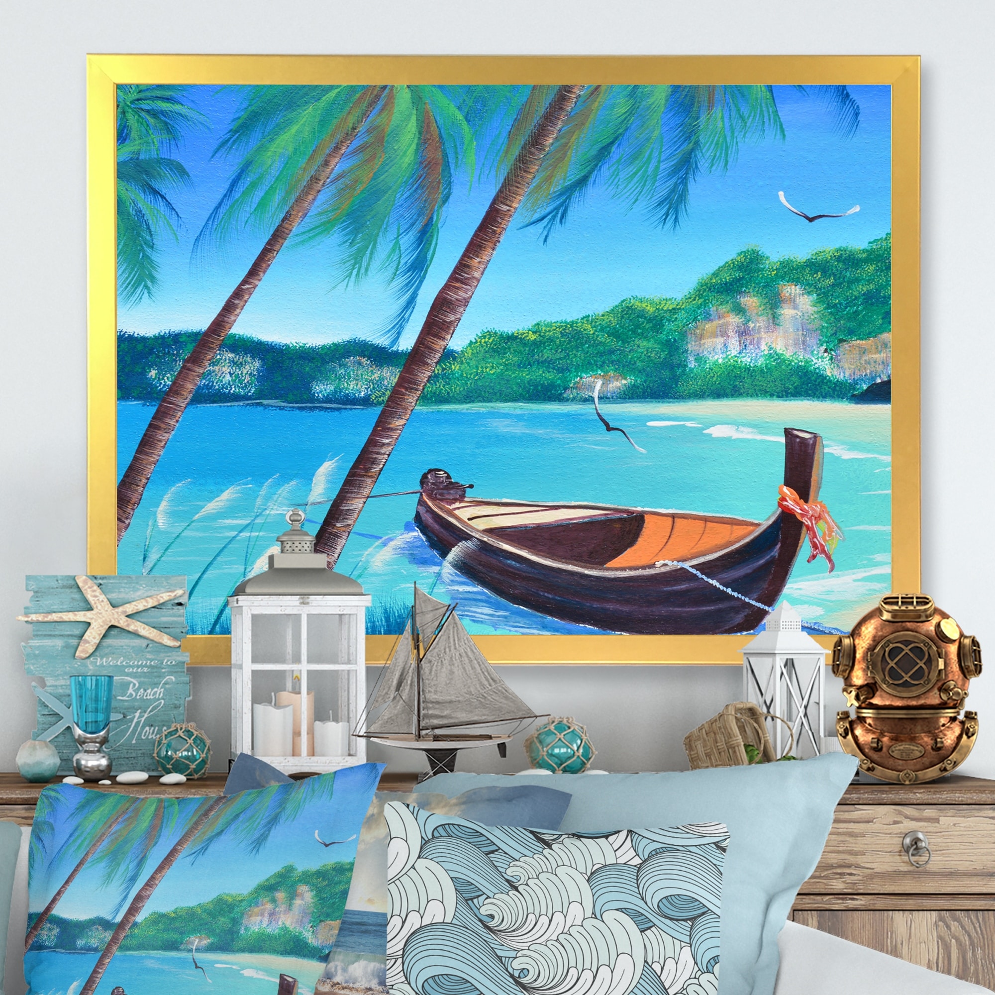 Designart "Boat On Coconut Tree Beach" Nautical & Coastal Framed artwork