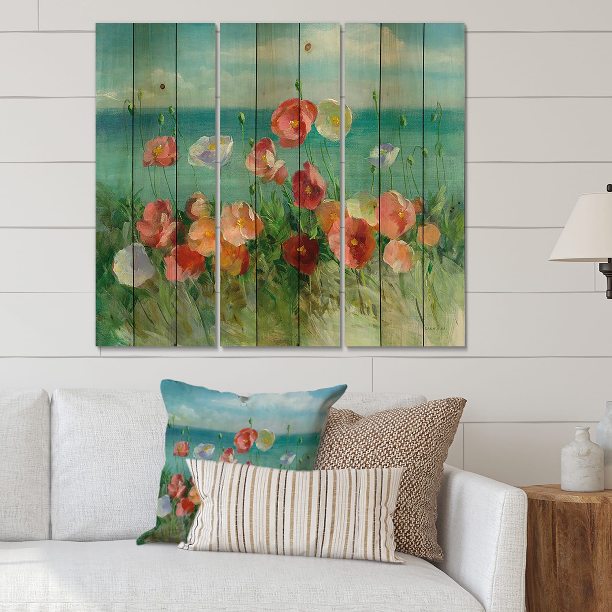 Designart 'RW Coastal Poppies' Cottage Print on Natural Pine Wood - 3 Panels