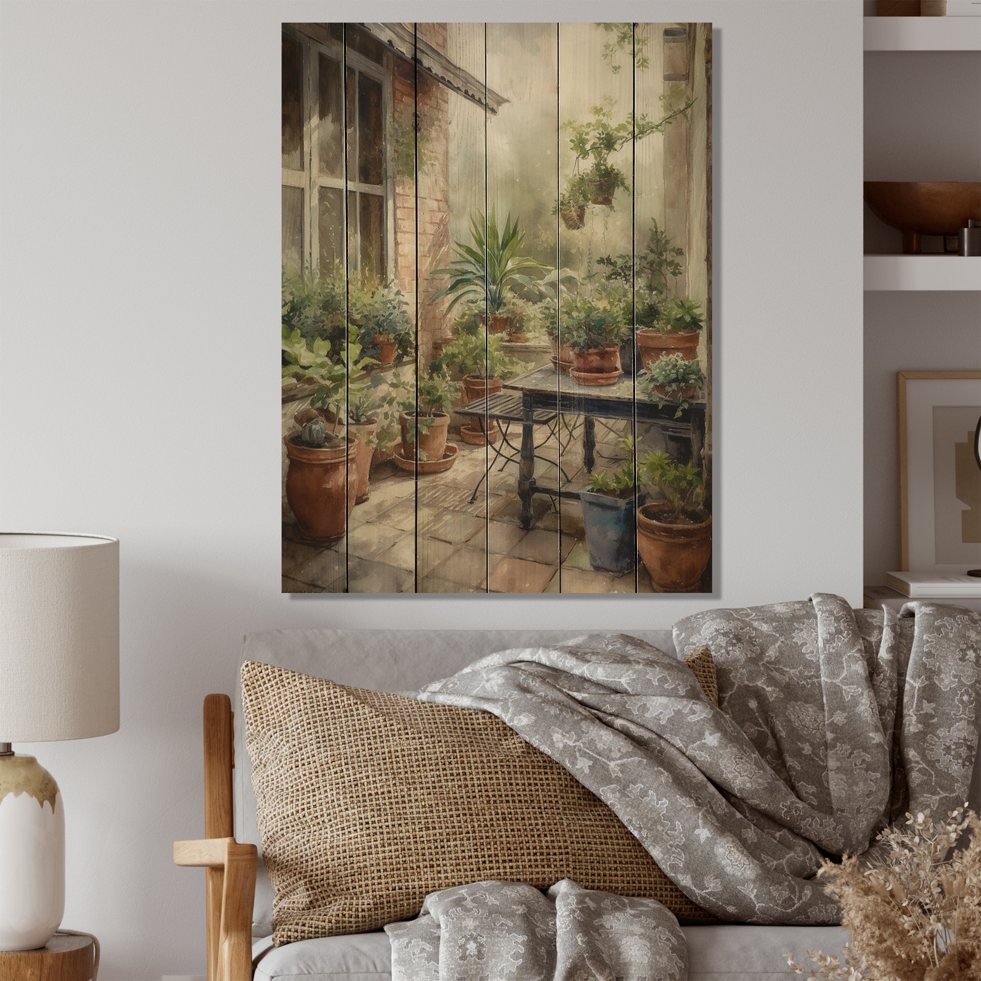 Designart "Cottage Balcony Garden I" Cottage Landscape Print on Natural Pine Wood