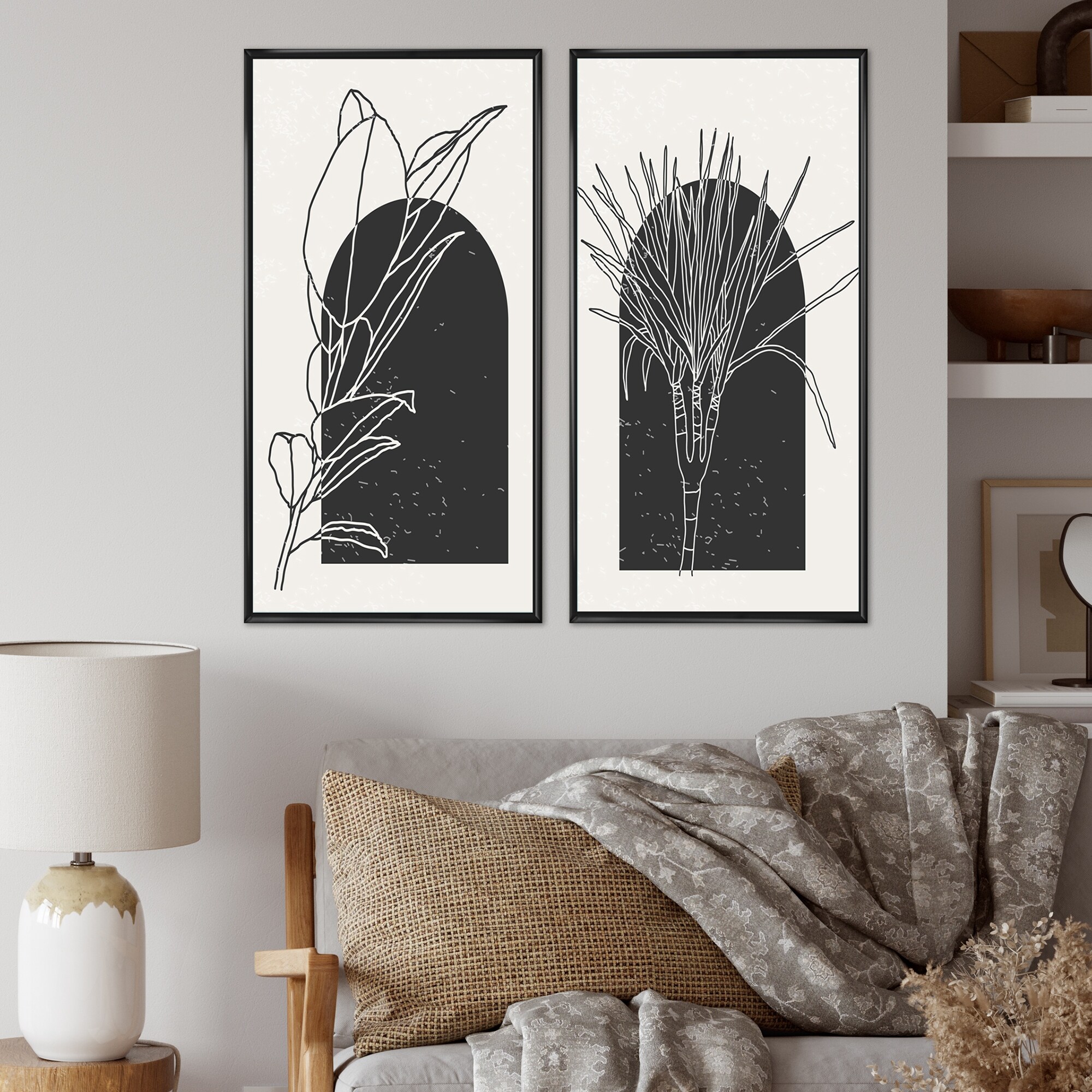 Designart "Minimalist Botanical Line Art With Palm Leaves I" Cottage Framed Art Set of 2 Pieces