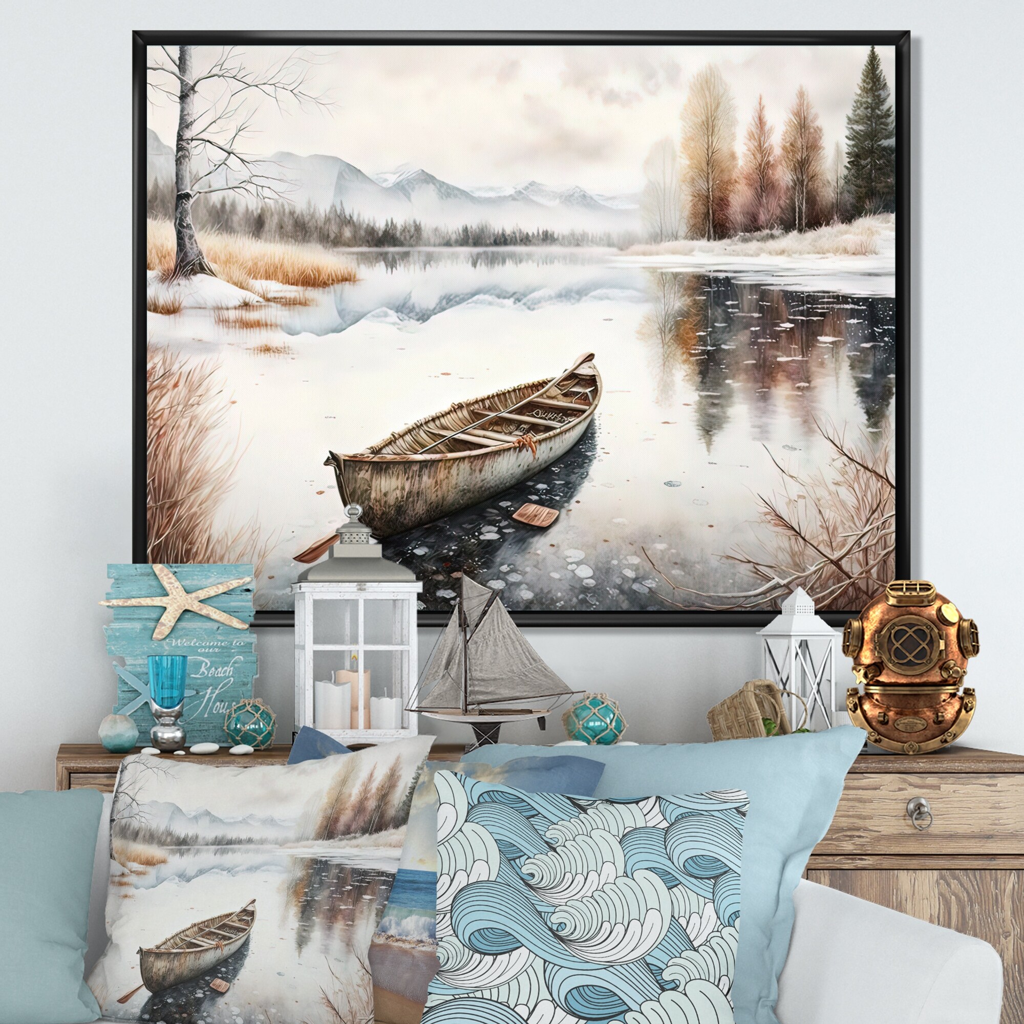 Designart "Winter Scene With Canoe I" Farmhouse / Country Framed Canvas Art Print