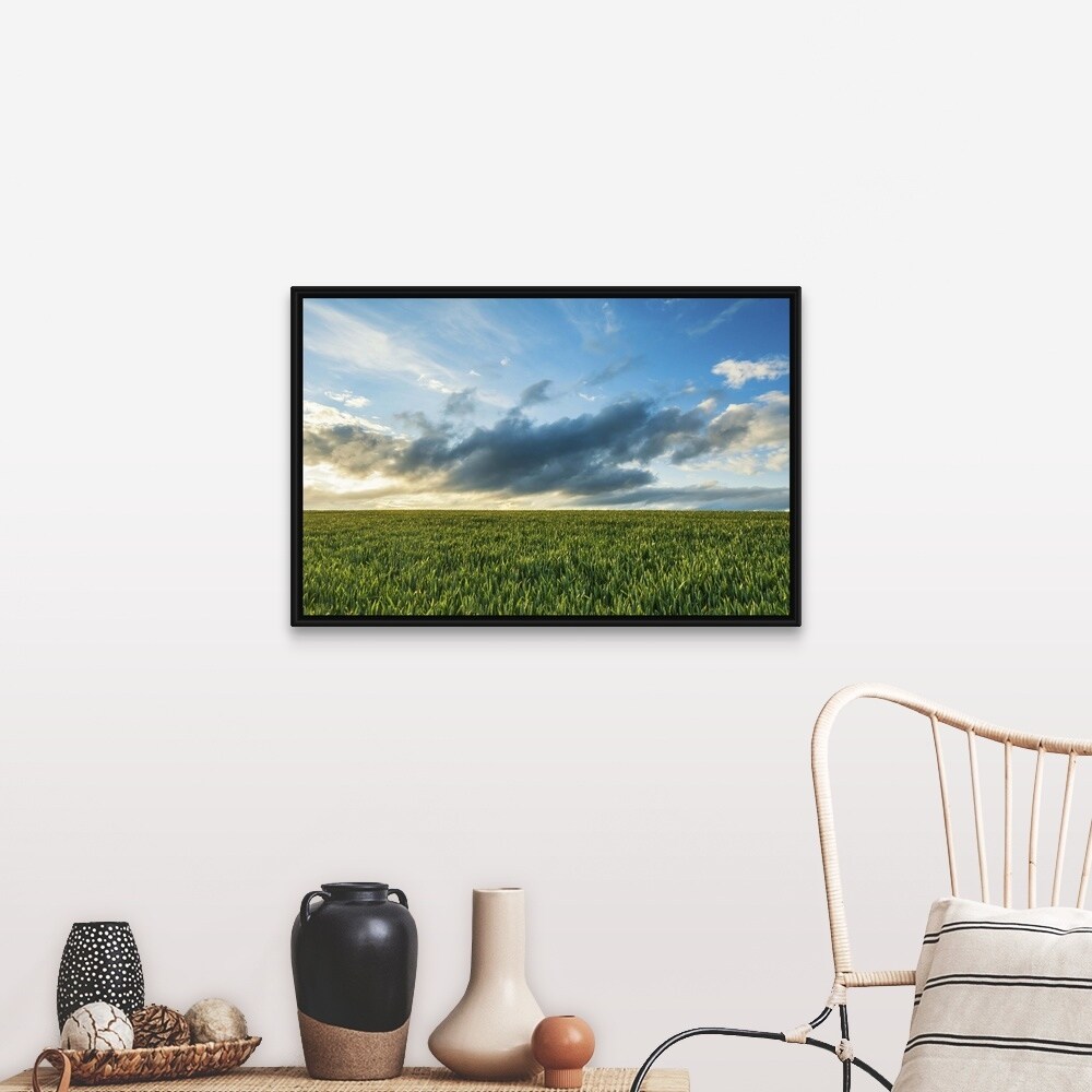 "A field of green crops at sunset" Black Float Frame Canvas Art