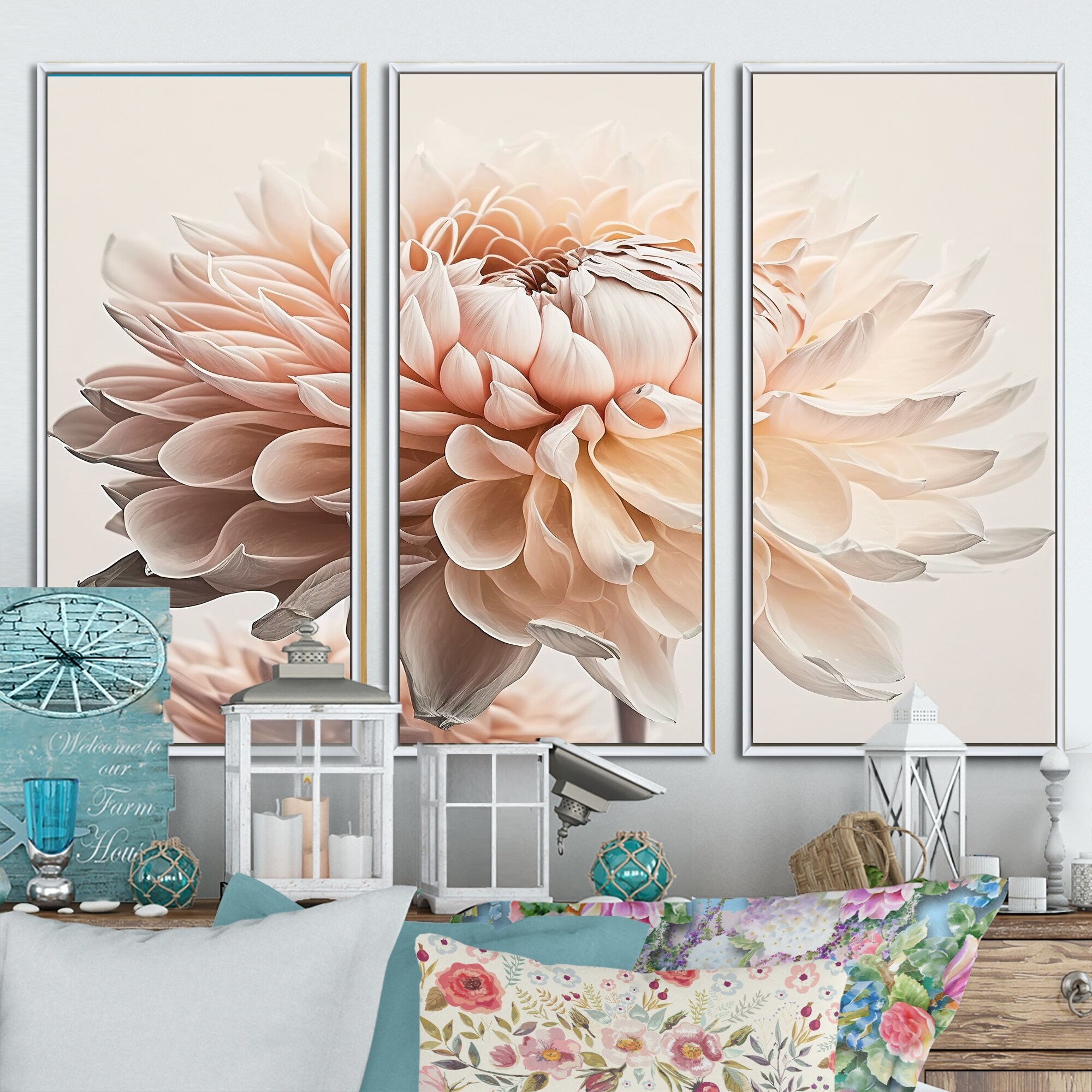 Designart "White Dahlia Flowers I" Floral Dahlia Framed Canvas Art Print - 3 Panels