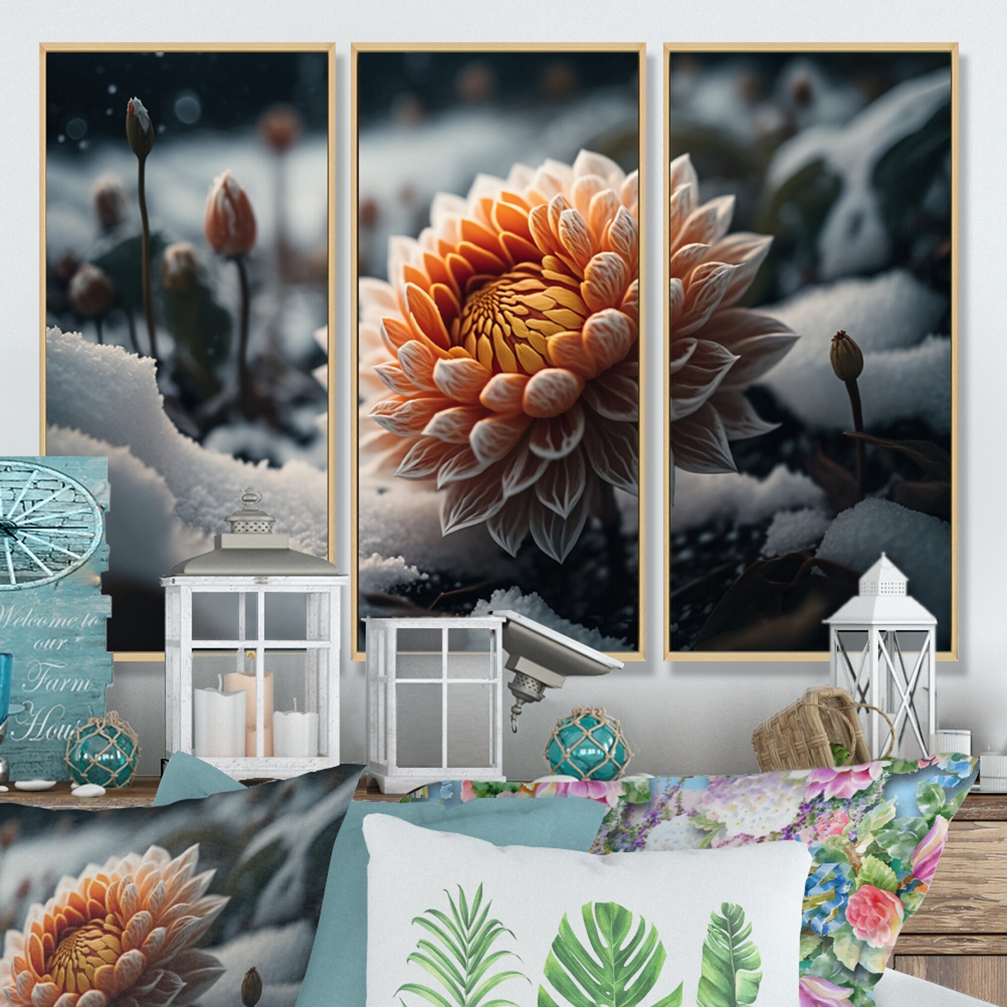Designart "A Blooming Orange Dahlia Flower in Winter III" Floral Dahlia Framed Canvas Art Print - 3 Panels